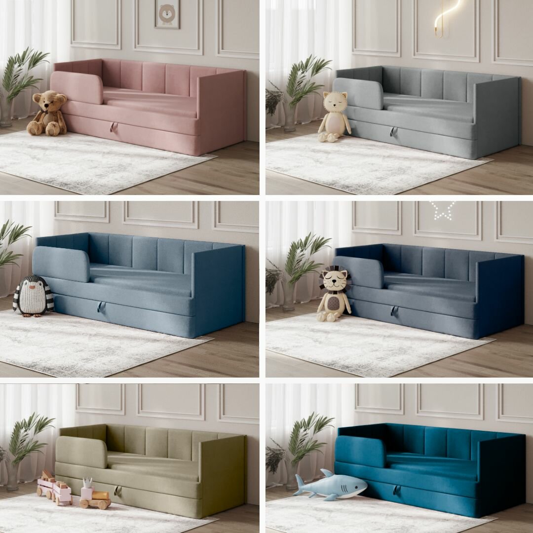Детский диван кровать Челси 90х200 см морская волна с матрасом, чехлом, выкатным ящиком и бортиком Кровать детская от 3х лет