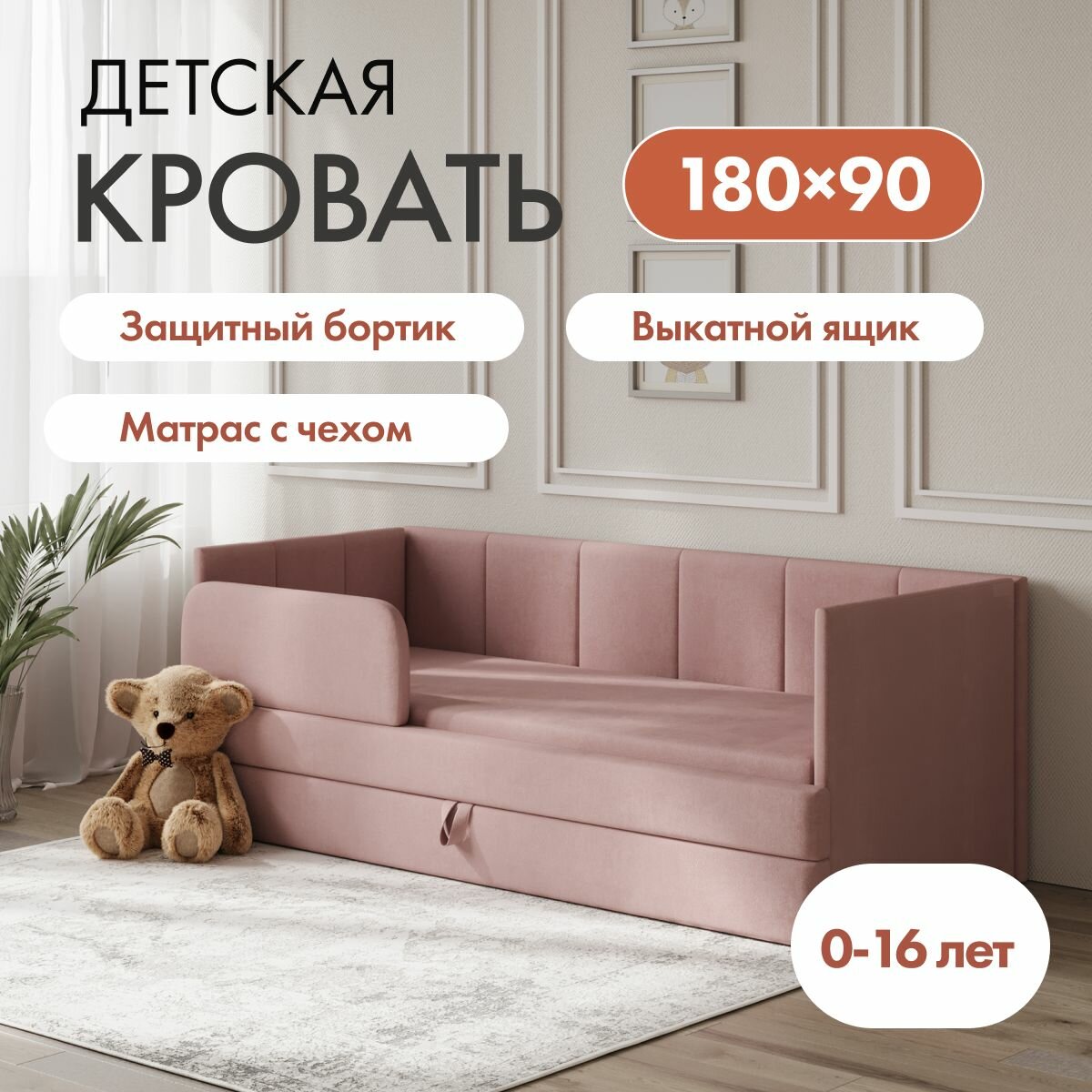 Детский диван кровать Челси 180х80 см розовый с матрасом, чехлом, выкатным ящиком и бортиком Кровать детская от 3х лет