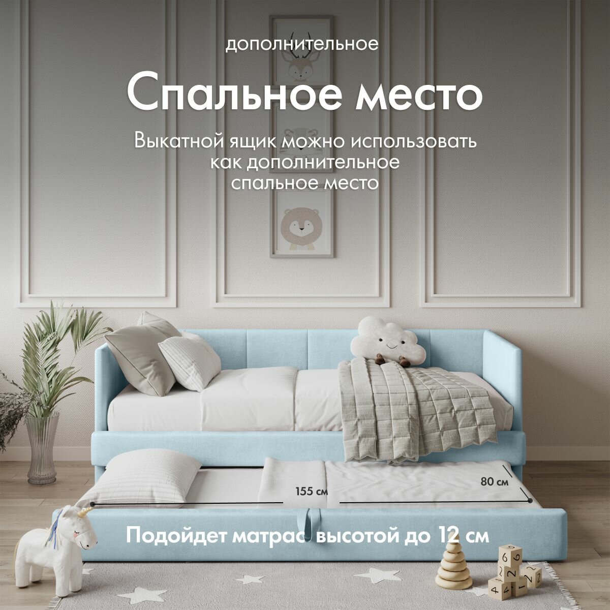 СохранитьДетский диван кровать Челси 160х80 см голубой с матрасом, чехлом и выкатным ящиком Кровать детская от 3х лет интересное: