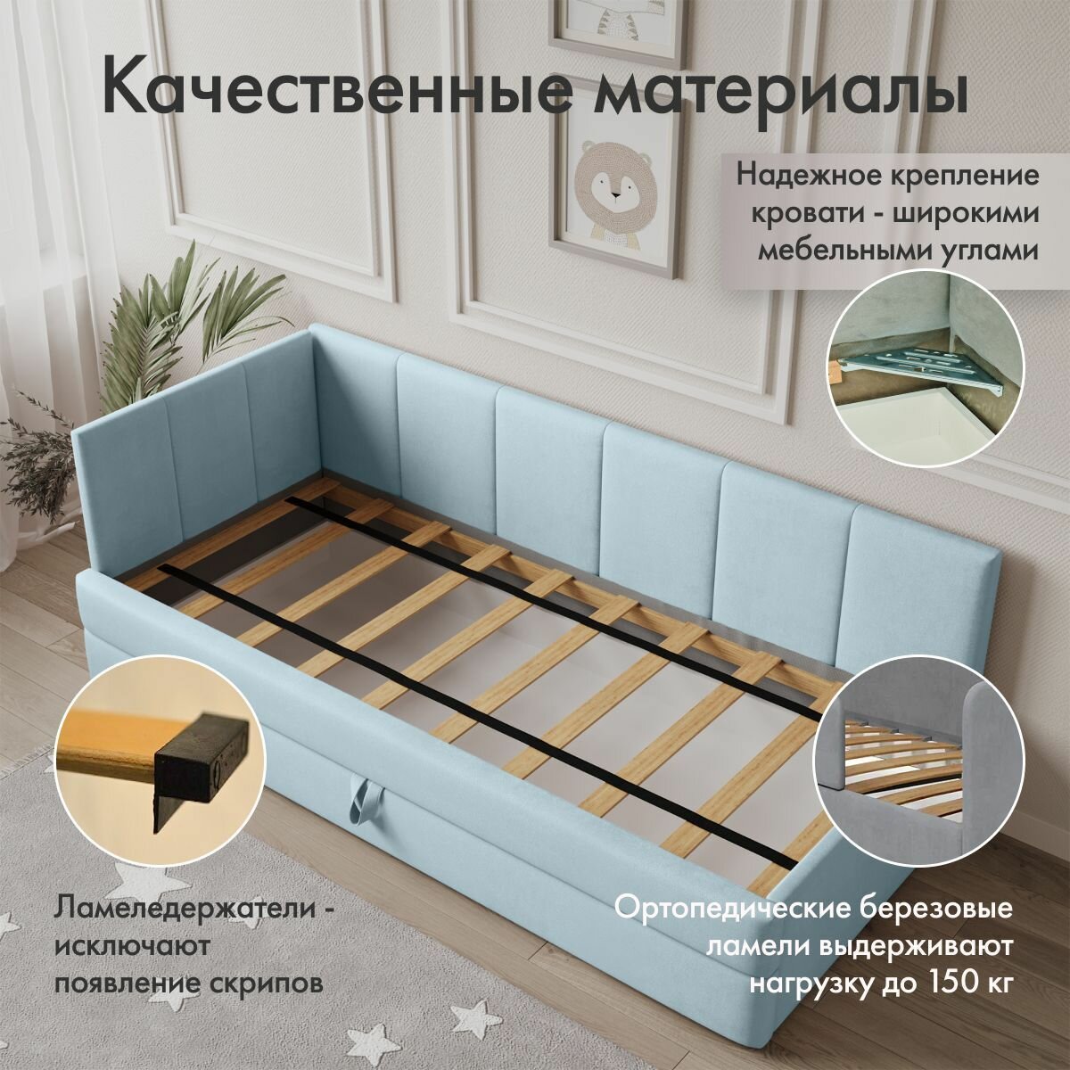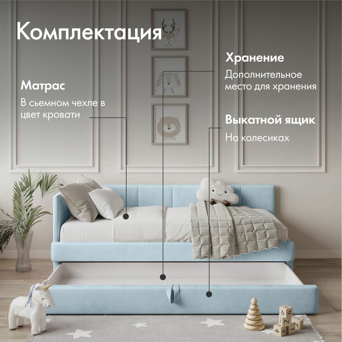 СохранитьДетский диван кровать Челси Лайт 180х90 см голубой с матрасом, чехлом и выкатным ящиком Кровать детская от 3х лет интересное: