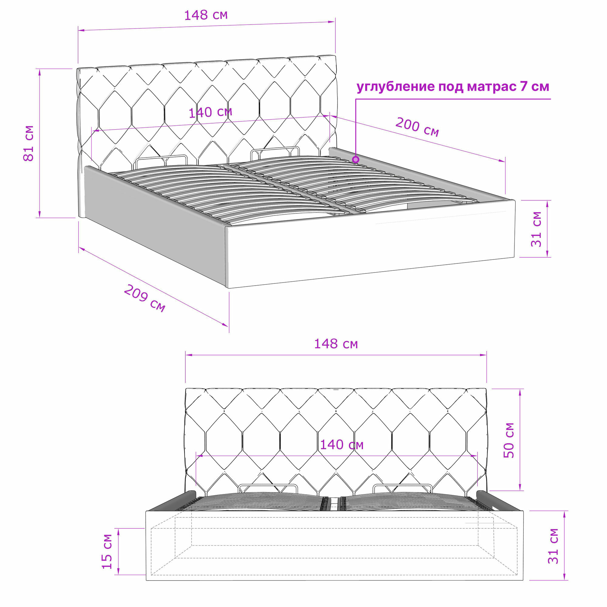 Кровать 140х200 с матрасом с подъемным механизмом двуспальная Техас с ортопедическим основанием и ящиком для белья, велюр лиловый
