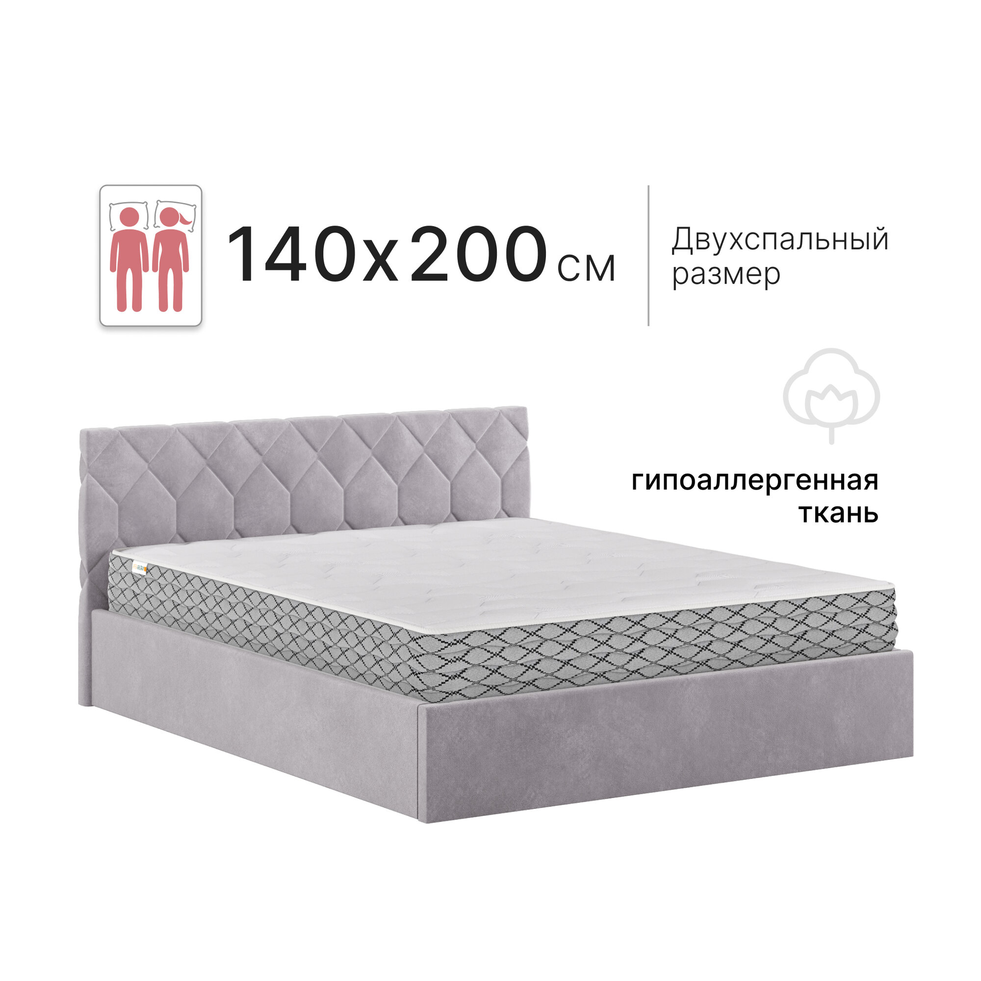 Кровать Техас двуспальная 140х200 с матрасом подъемный механизм с ортопедическим основанием и ящиком для белья, велюр светло-серый