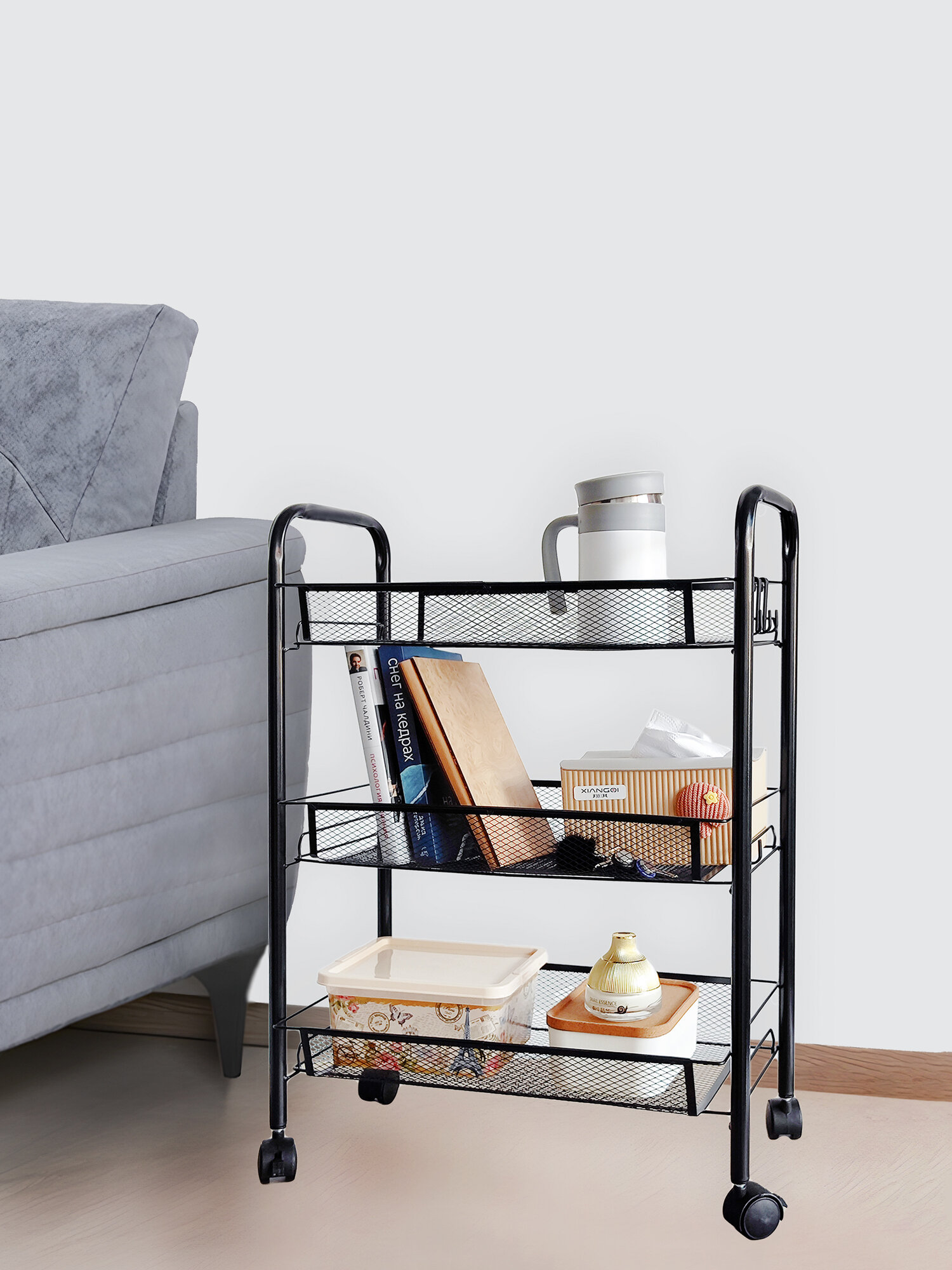Этажерка для ванной, кухни и прихожей из металла с 3-мя сетчатыми полками на колесах, нагрузка до 15 кг, черный интересное: