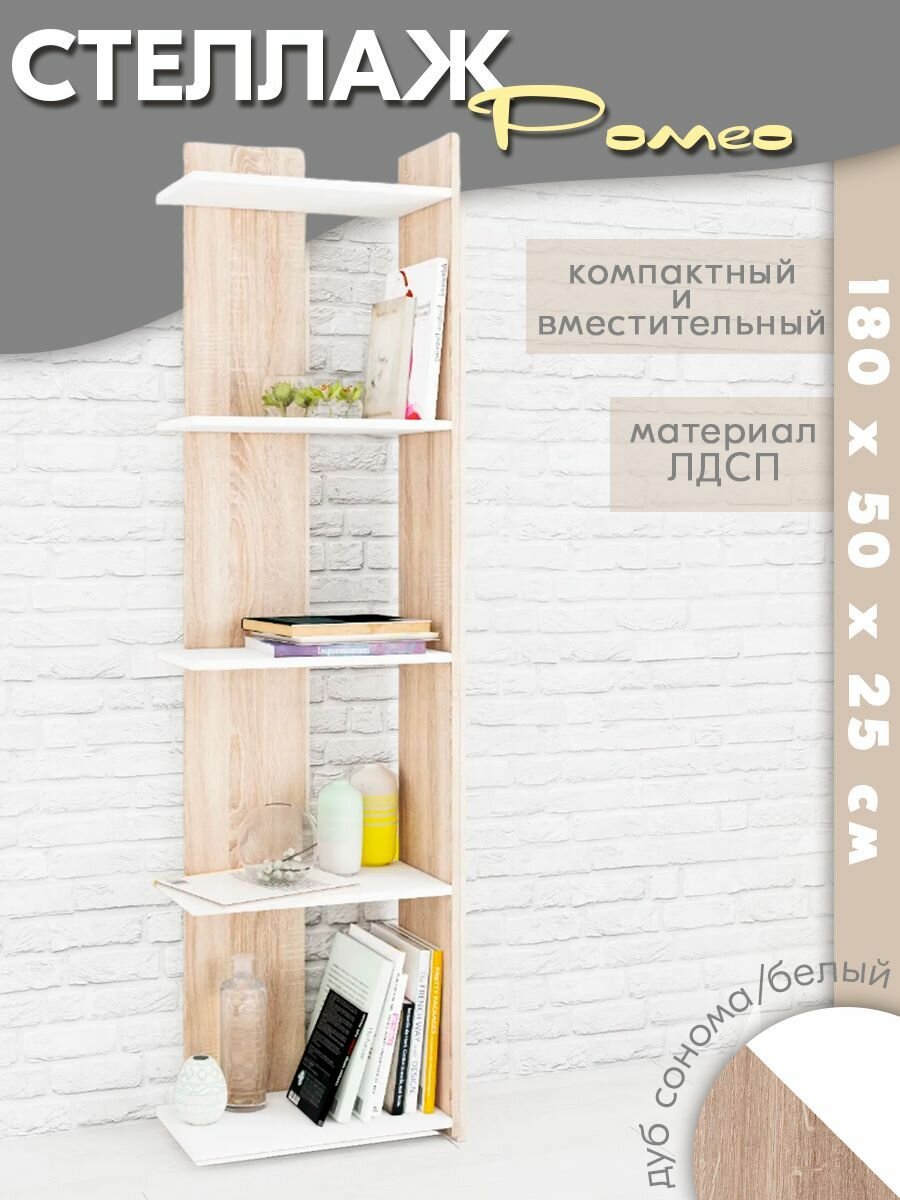 Стеллаж "Ромео 7" Дуб сонома/ Белый ЛДСП с полками для гостиной, спальни, зала, прихожей 1800х500х250, тэкс интересное: