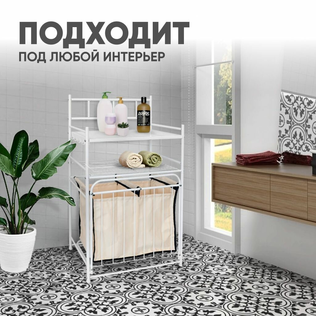 Стеллаж металлический белый напольный для ванной с корзиной для белья