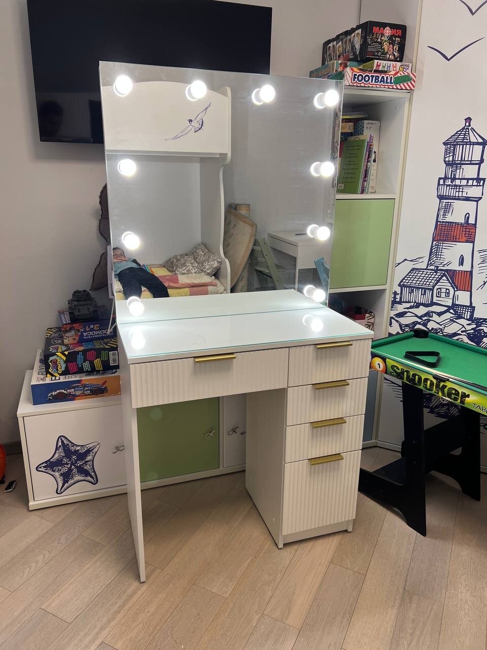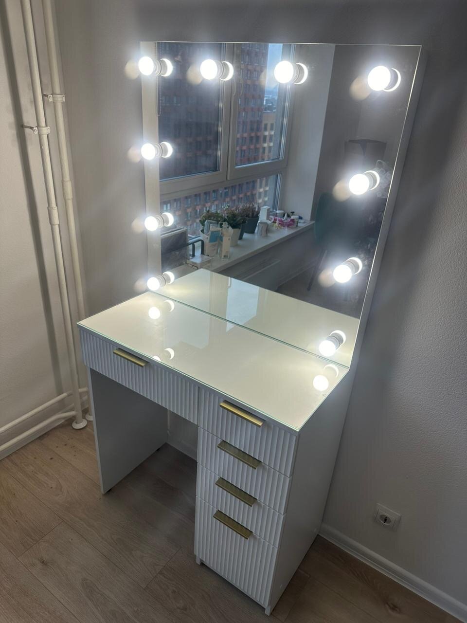 Туалетный столик GRIMSTOL 2Р80ВА, гримёрное зеркало с лампочками, LED-подсветка, фасады МДФ, белый, Гранд Волна