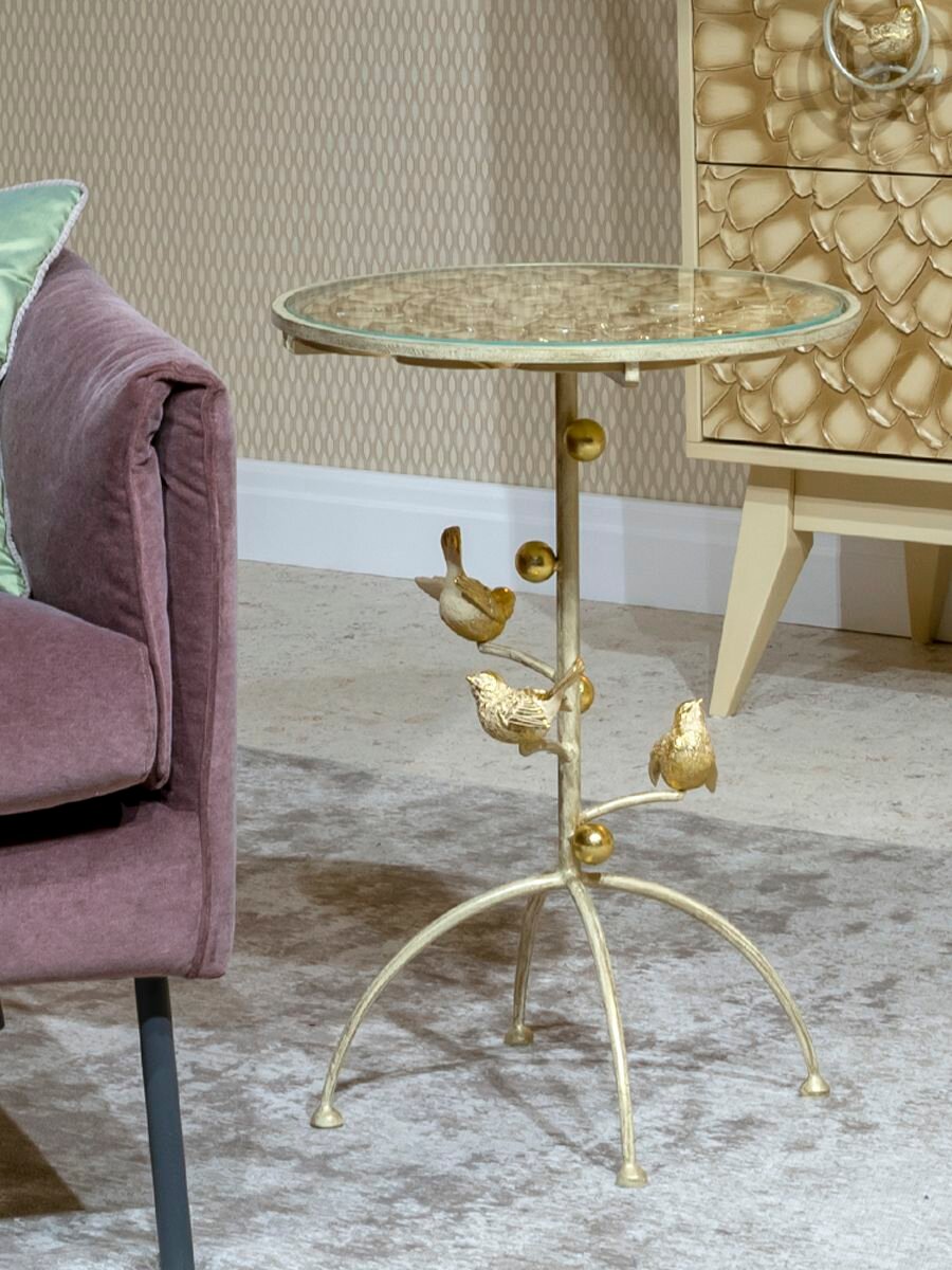 Купить Кофейный круглый столик Bogacho Терра со стеклянной столешницей и фигурной металлической ножкой с птичками