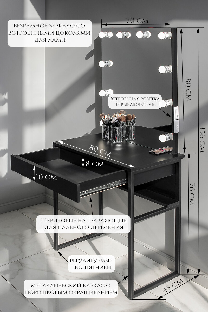 Ниже Вы можете прочитать отзывы на Туалетный столик черный с безрамным зеркалом на металлокаркасе LOFT, ознакомится с подробными характеристиками, посмотреть интересные обзоры и фотографии на Туалетный столик черный с безрамным зеркалом на металлокаркасе LOFT.