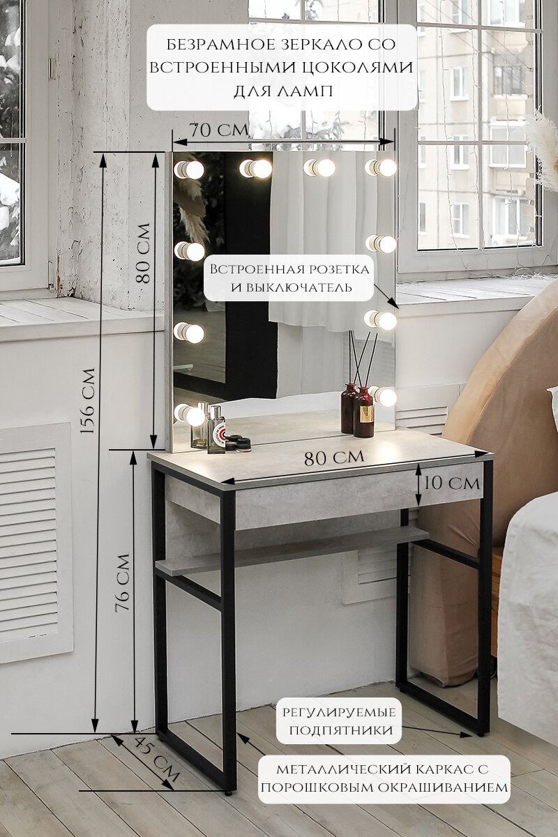 СохранитьТуалетный столик LOFT на металлокаркасе с безрамным зеркалом (Цемент) интересное: