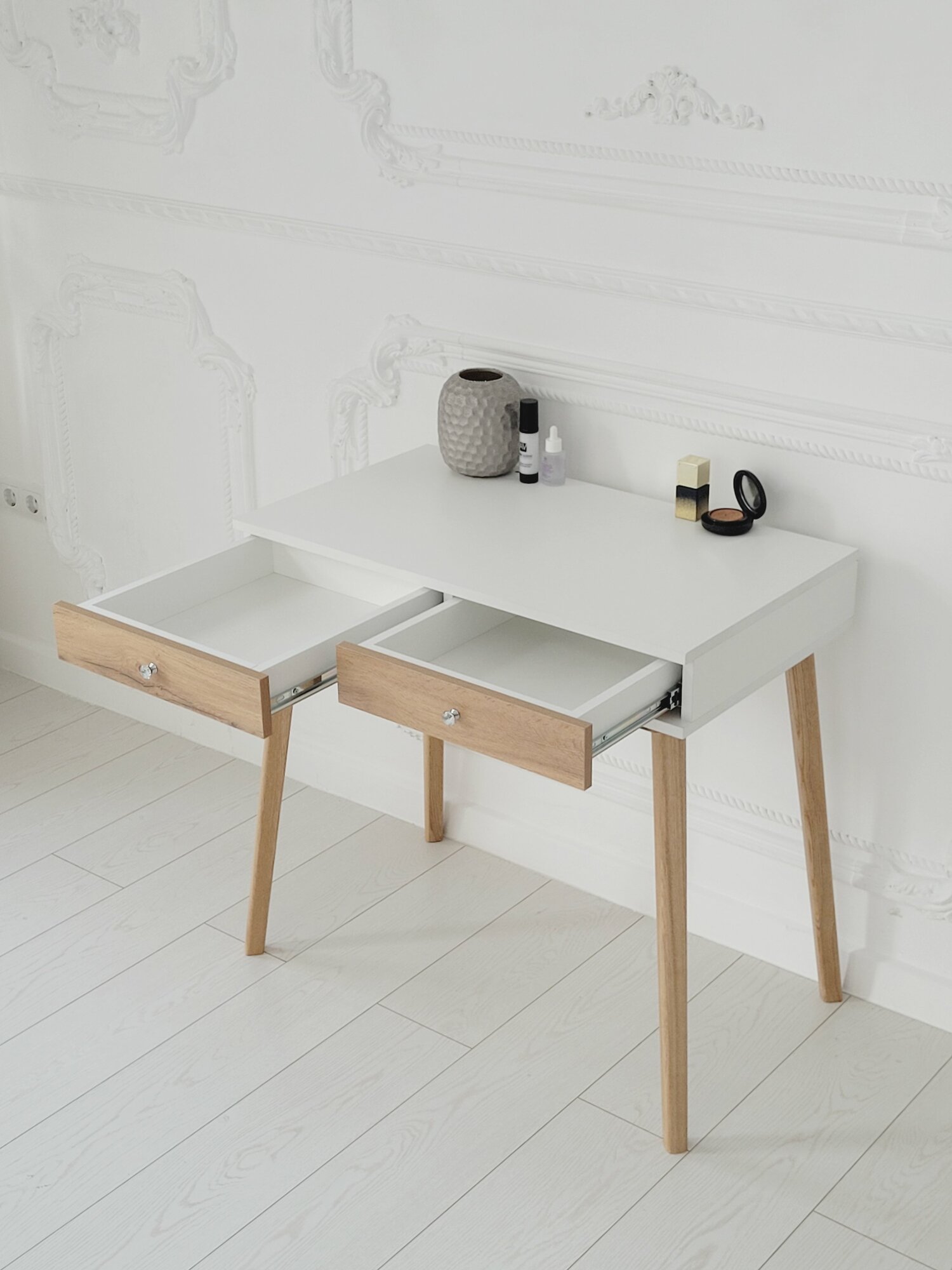 СохранитьГримерный столик с ящиком White+Votan на ножках из массива в цвете прозрачное масло интересное: