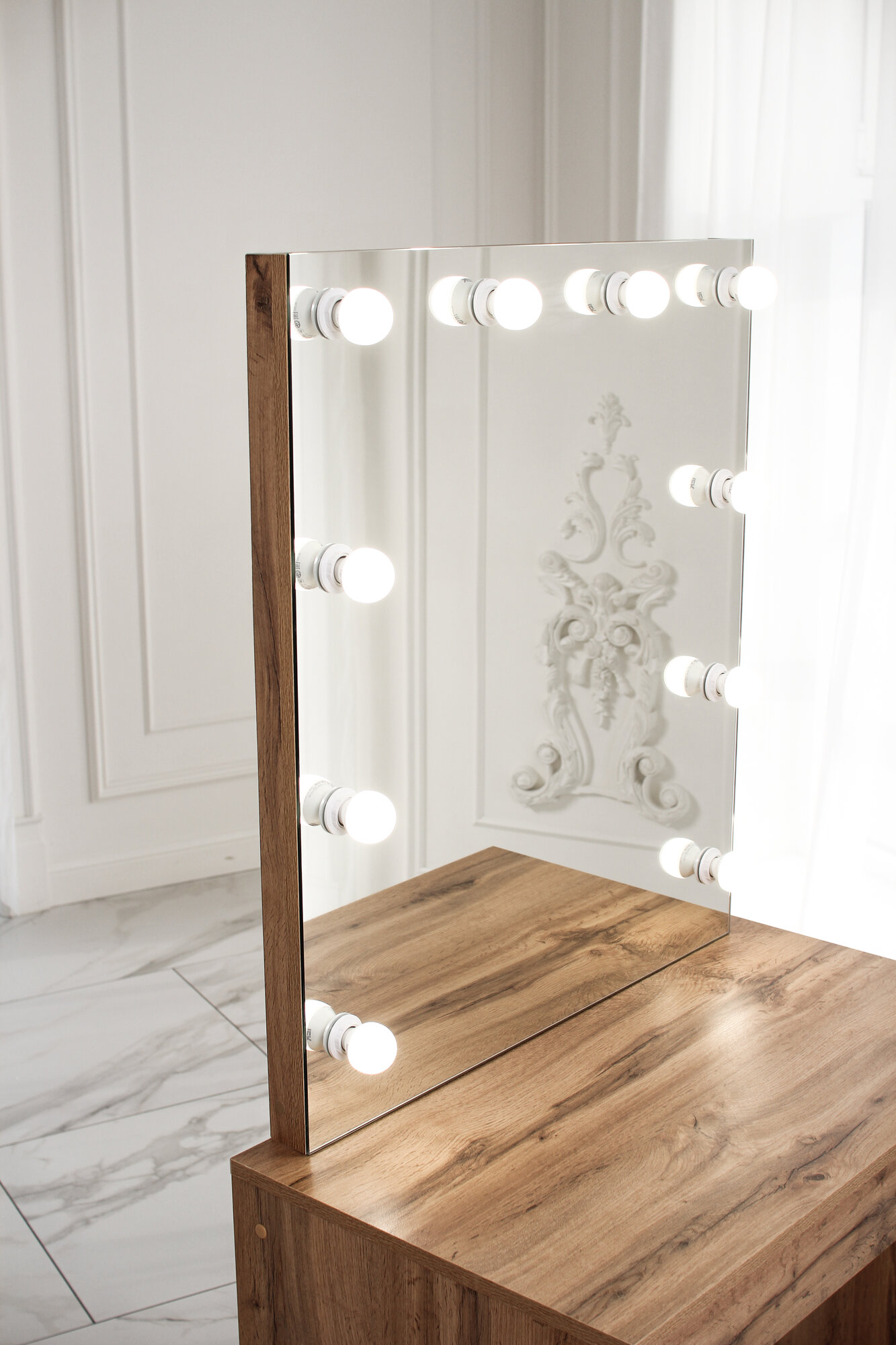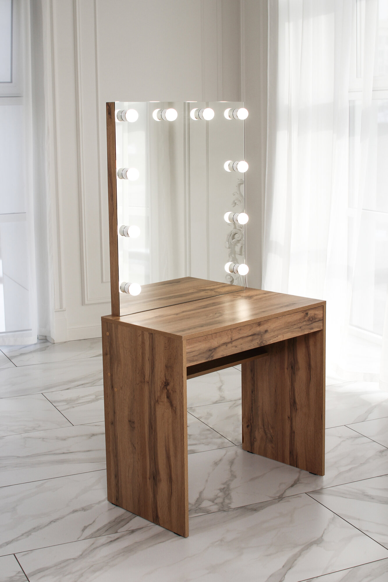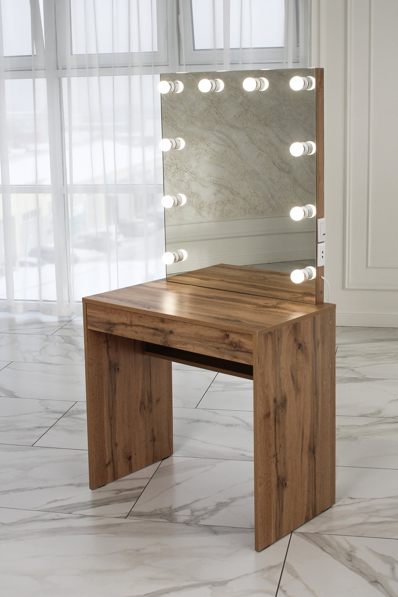Туалетный столик с ящиком и зеркалом с LED подсветкой, на глухих ножках ДУБ вотан