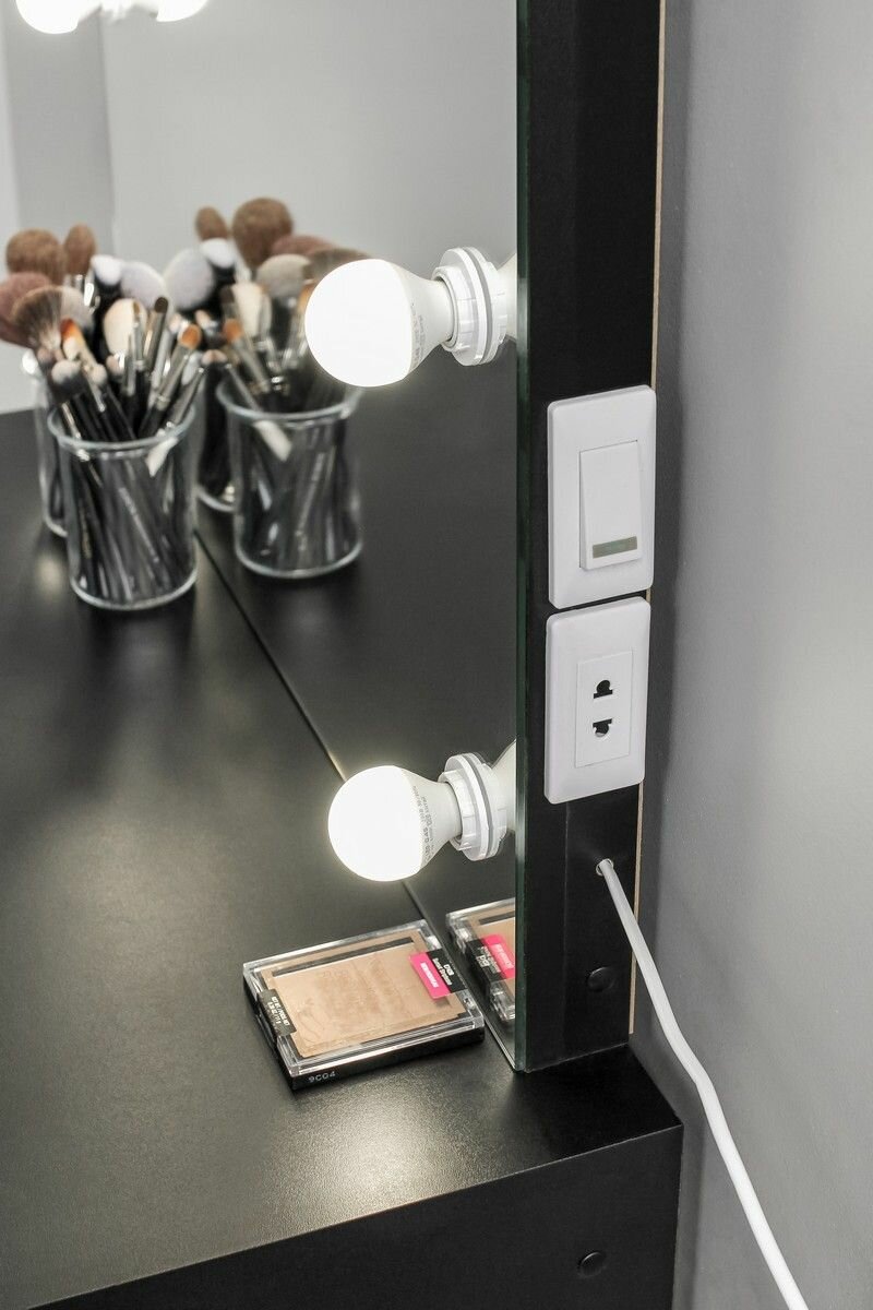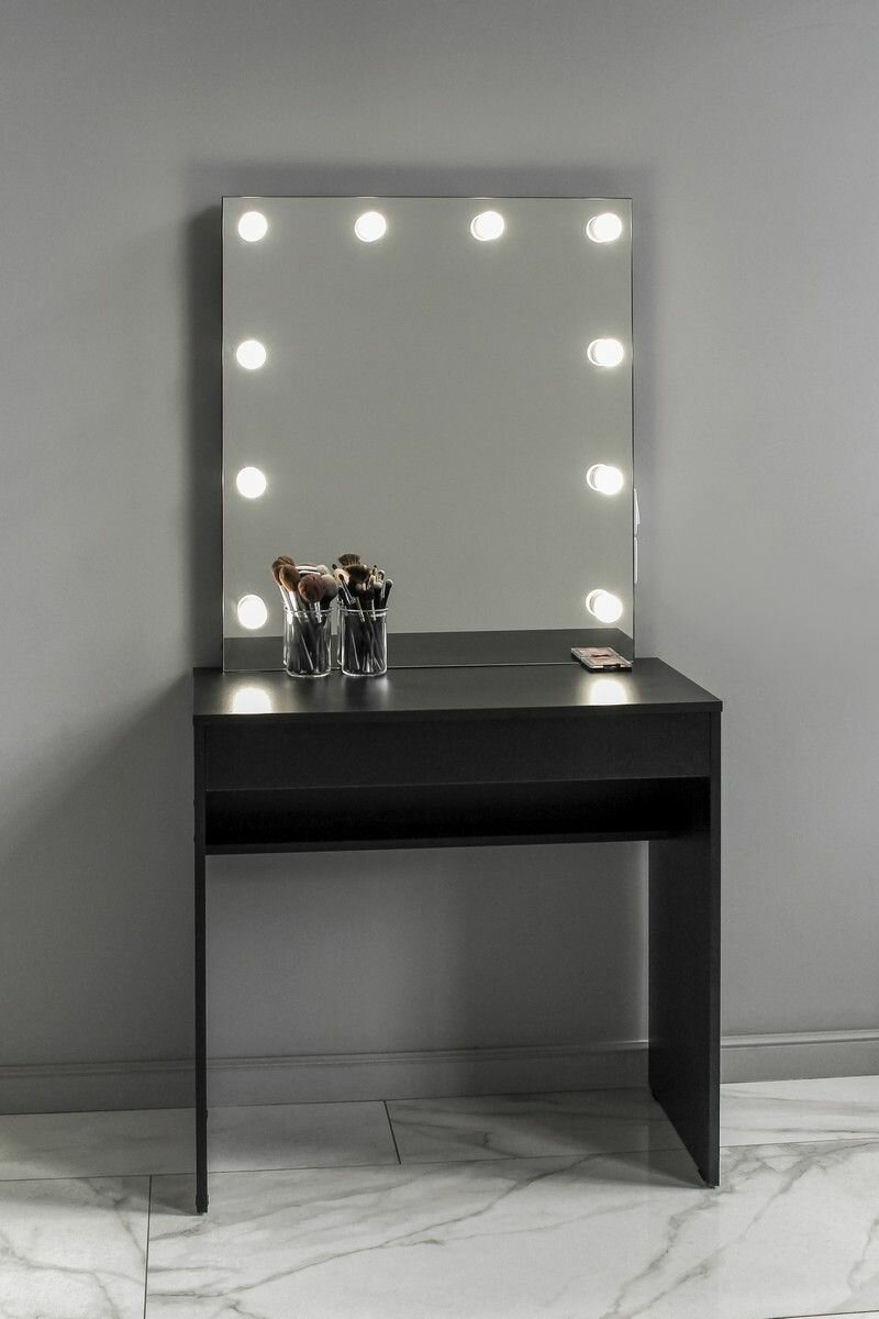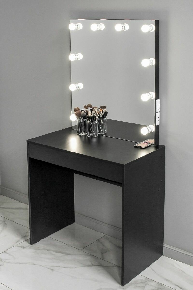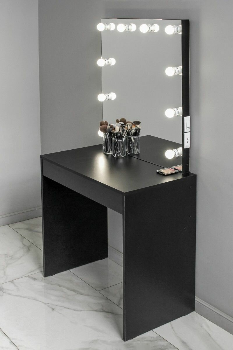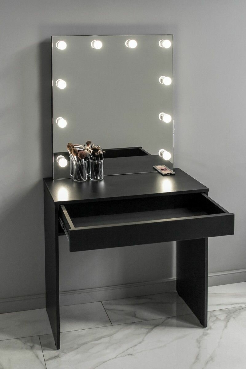 Туалетный столик с ящиком и зеркалом с LED подсветкой, на глухих ножках черный