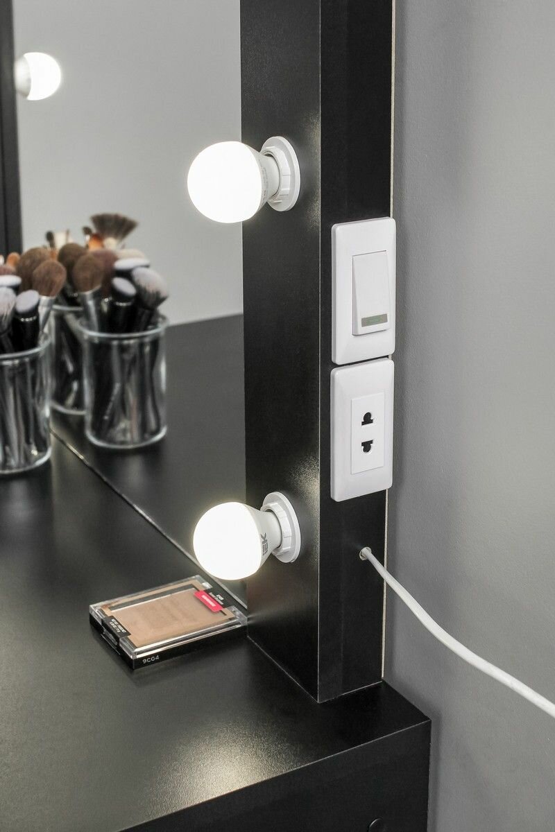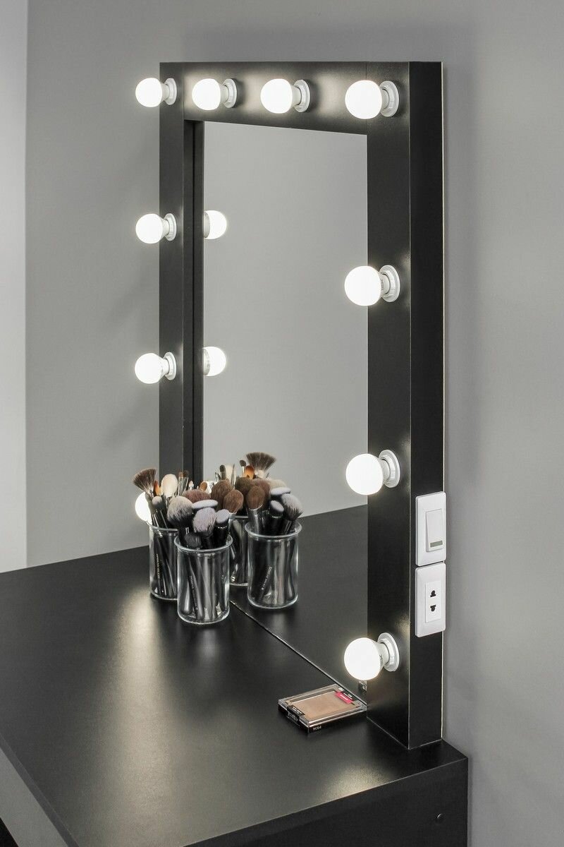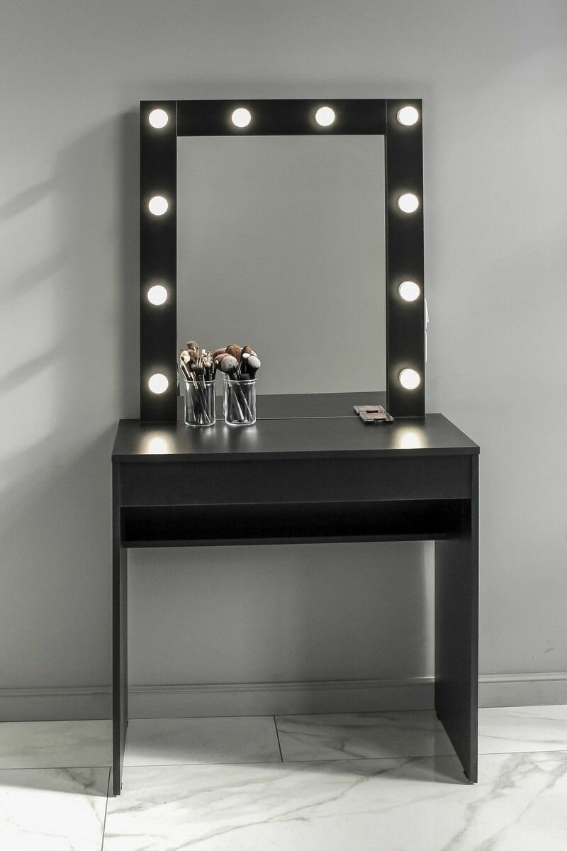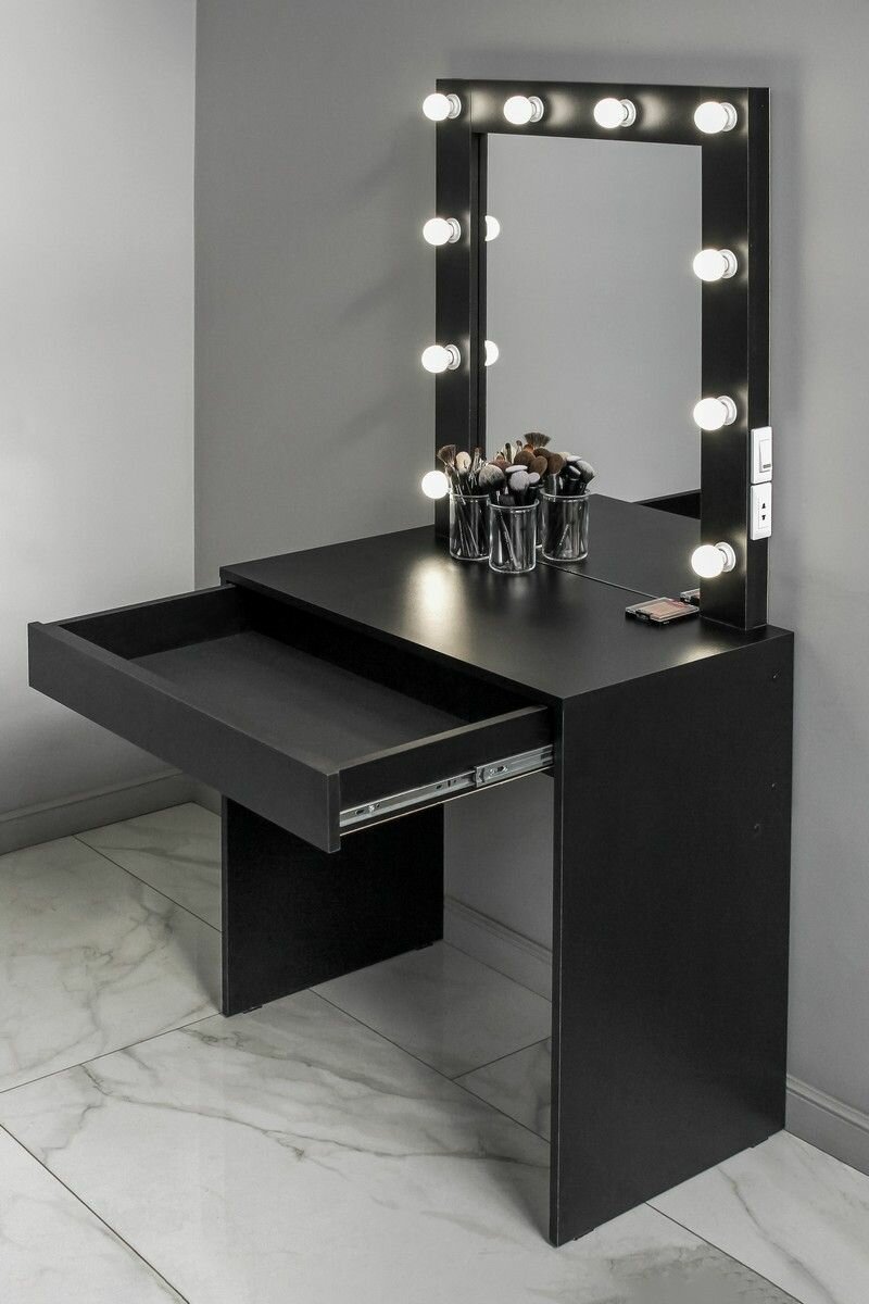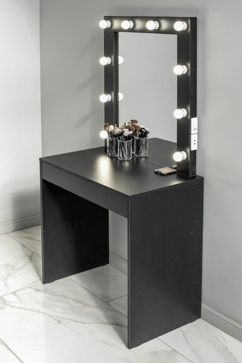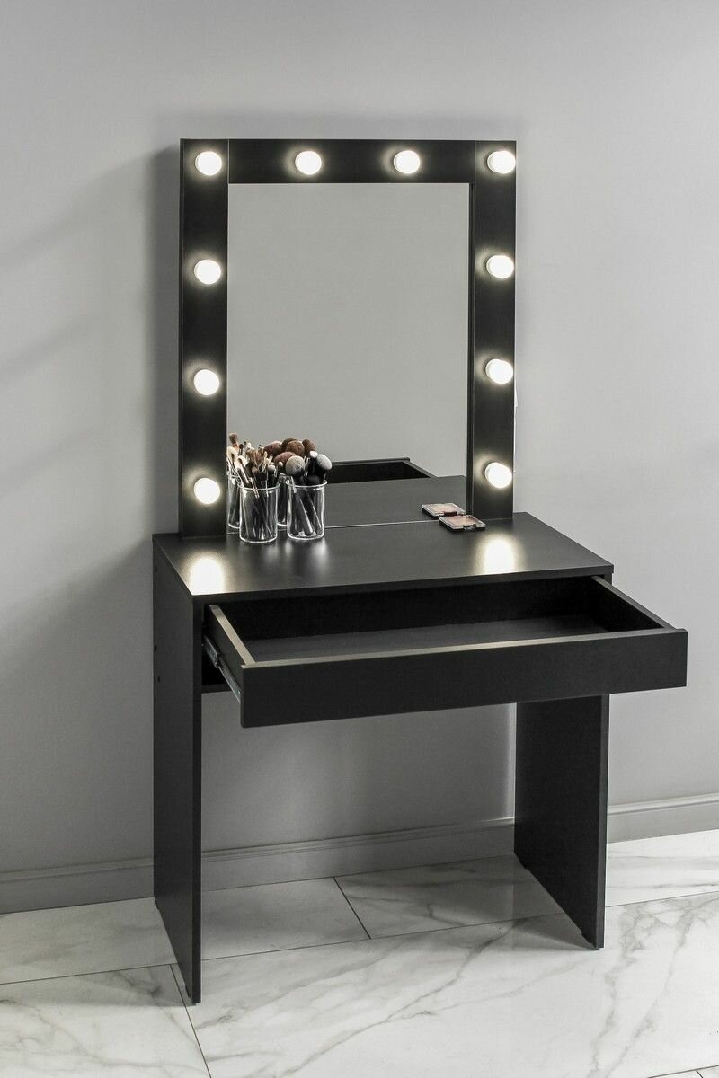 Туалетный столик с ящиком и зеркалом с LED подсветкой, на глухих ножках черный