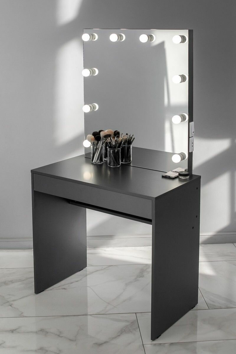 Туалетный столик с ящиком и зеркалом с LED подсветкой, на глухих ножках черный