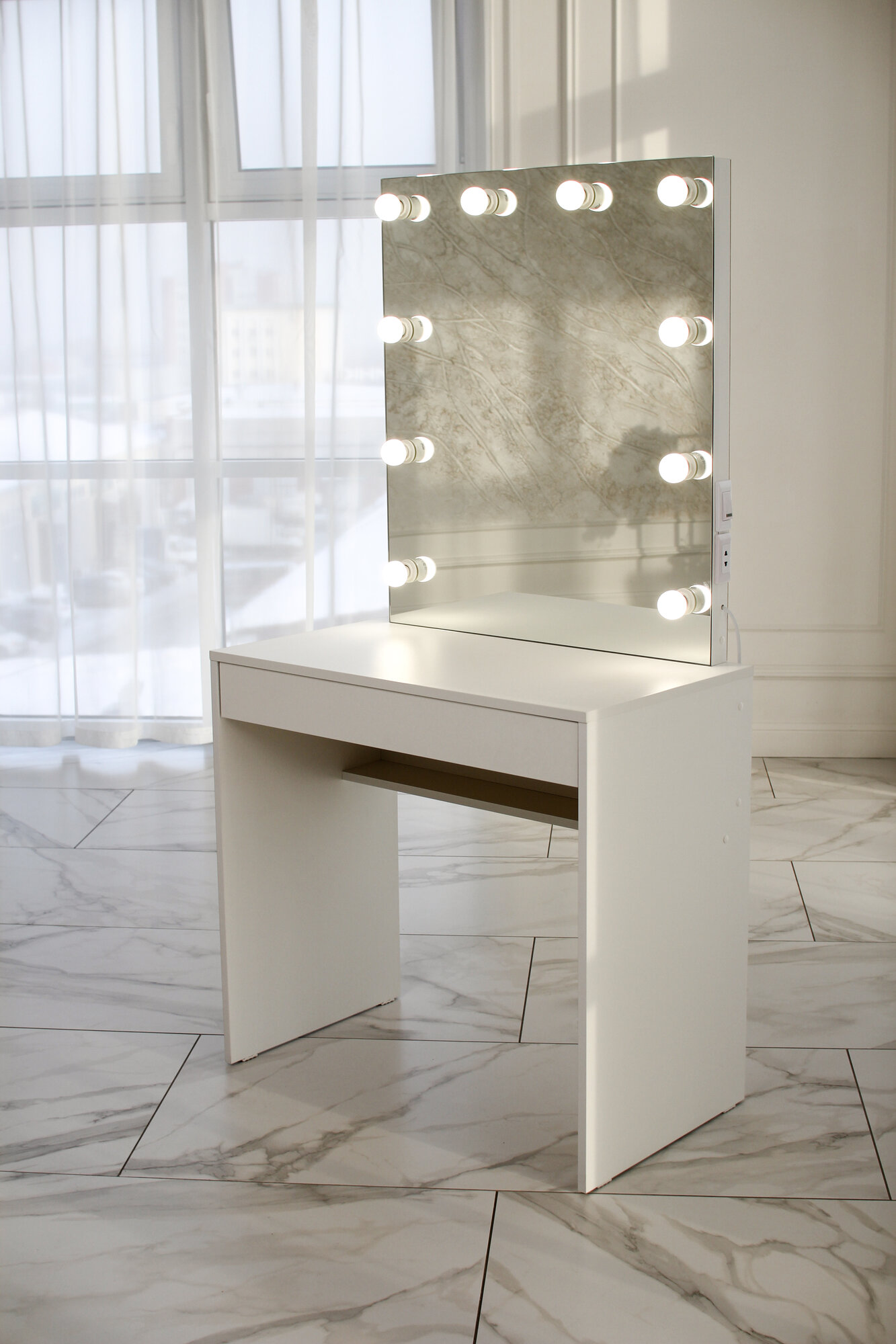 Туалетный столик с ящиком и зеркалом с LED подсветкой, на глухих ножках белый