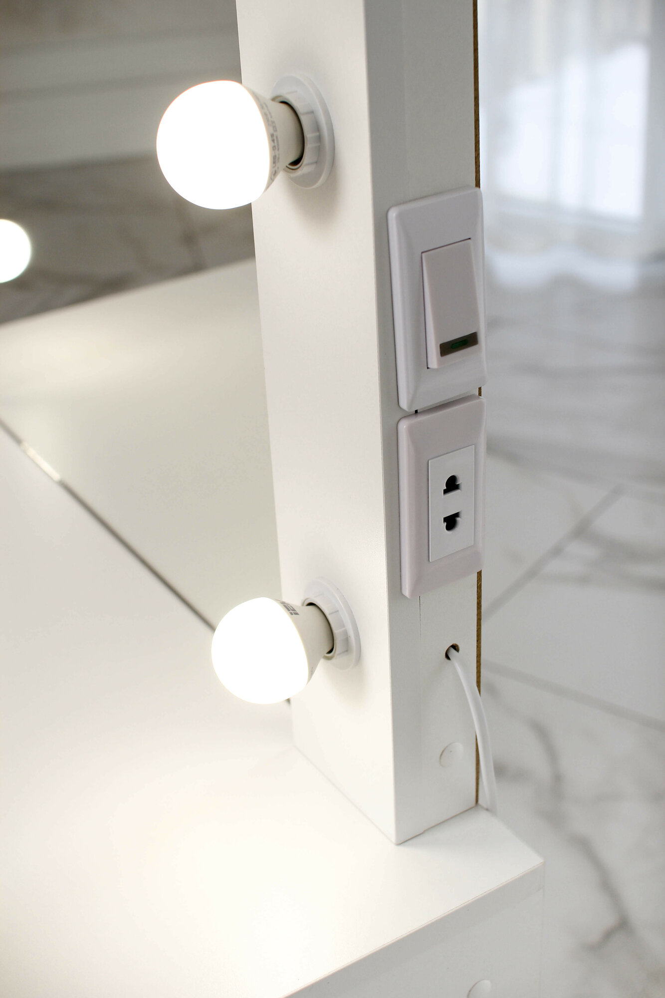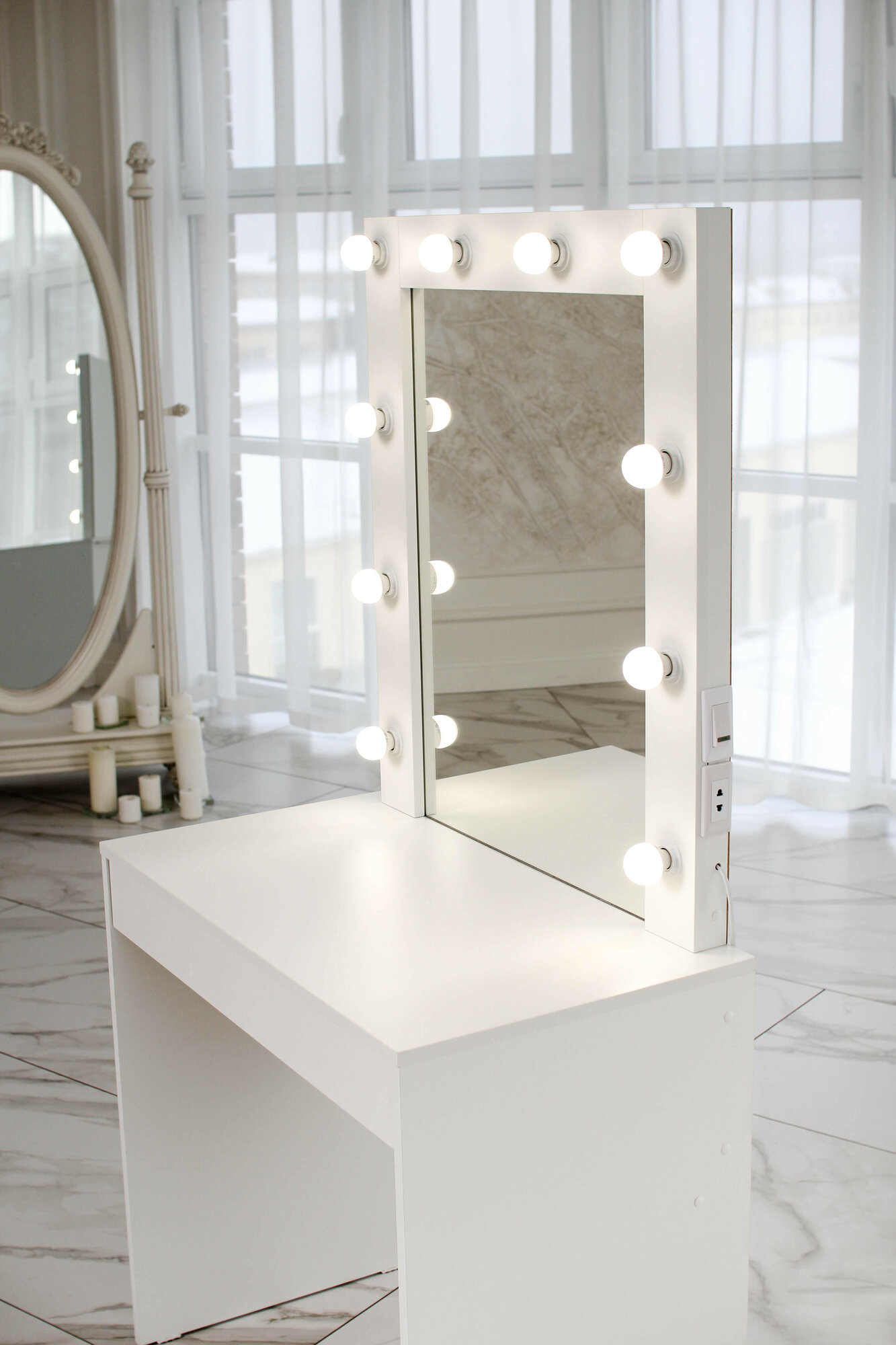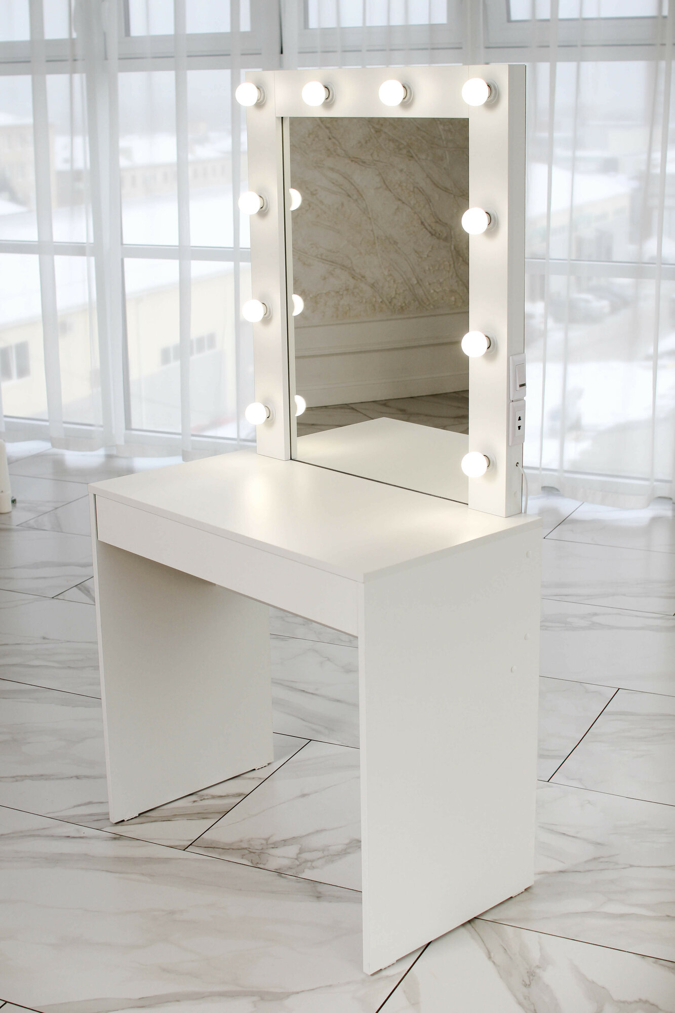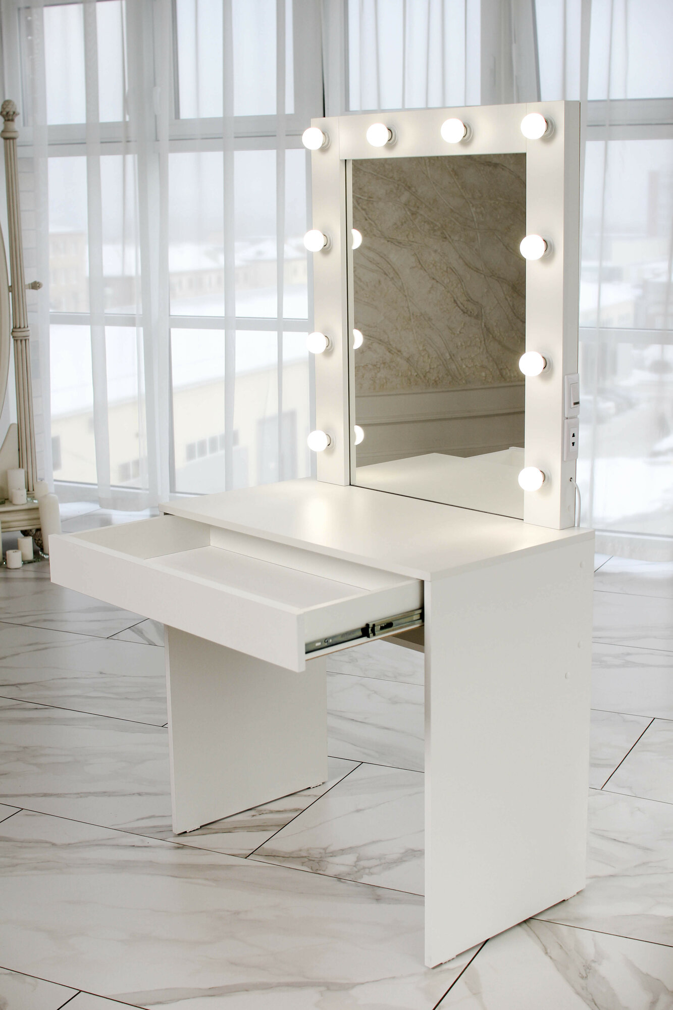 Туалетный столик с ящиком и зеркалом с LED подсветкой, на глухих ножках белый