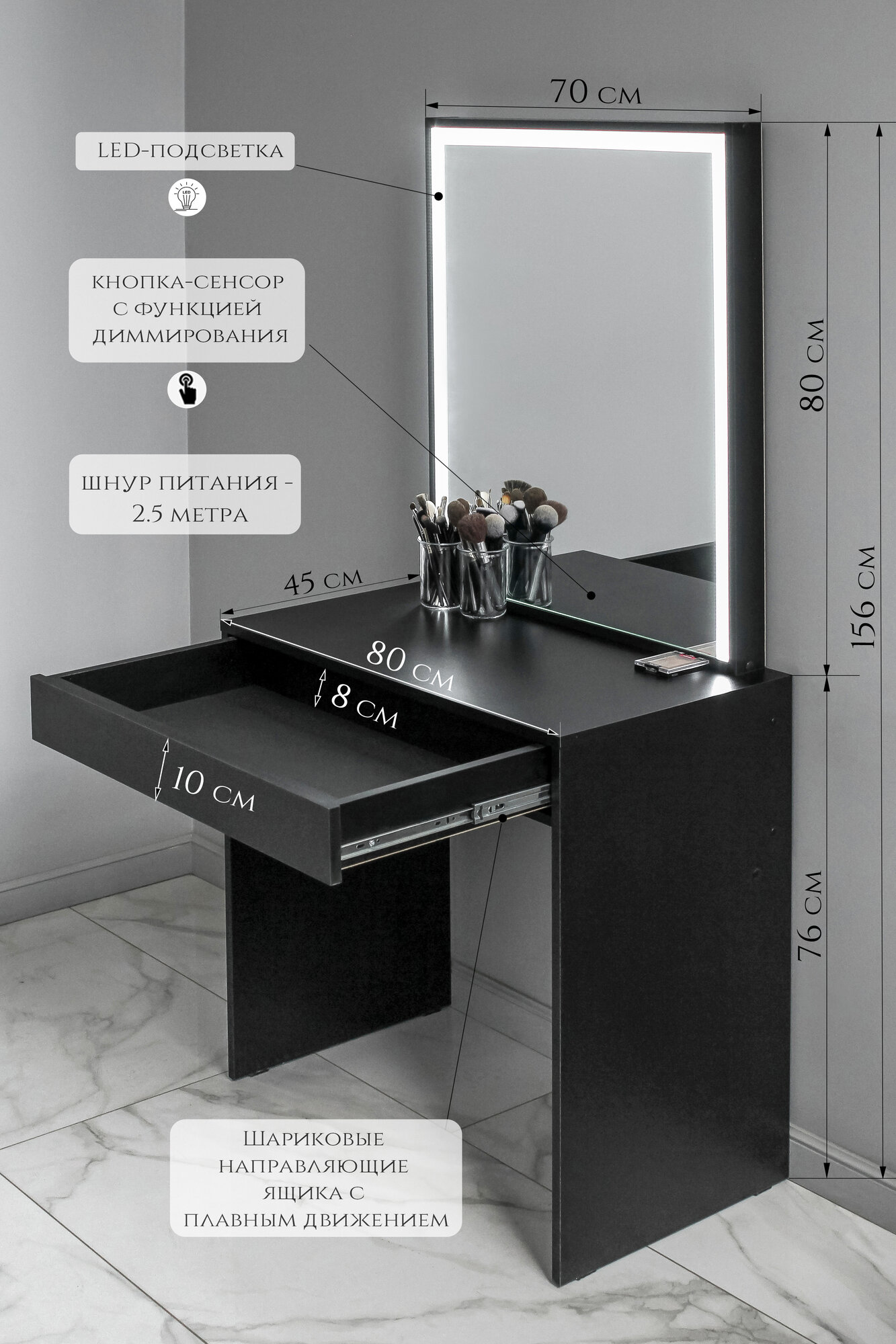 СохранитьТуалетный столик с ящиком и зеркалом с LED подсветкой, на глухих ножках черный интересное: