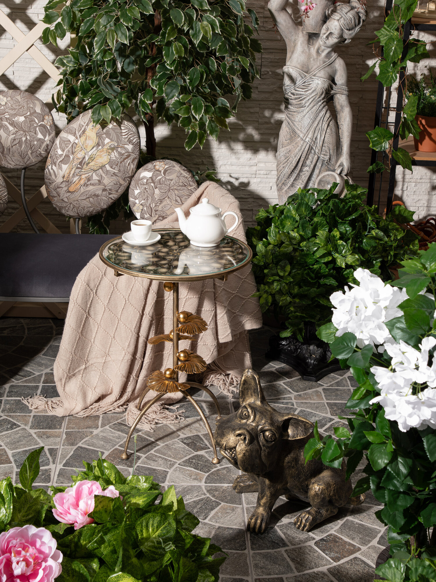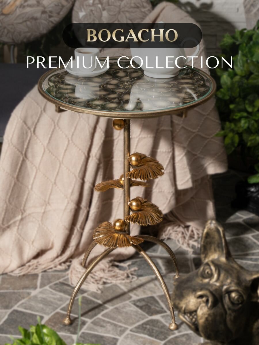 Купить Кофейный круглый столик Bogacho Терра Роуз со стеклянной столешницей и фигурной металлической ножкой с лепестками
