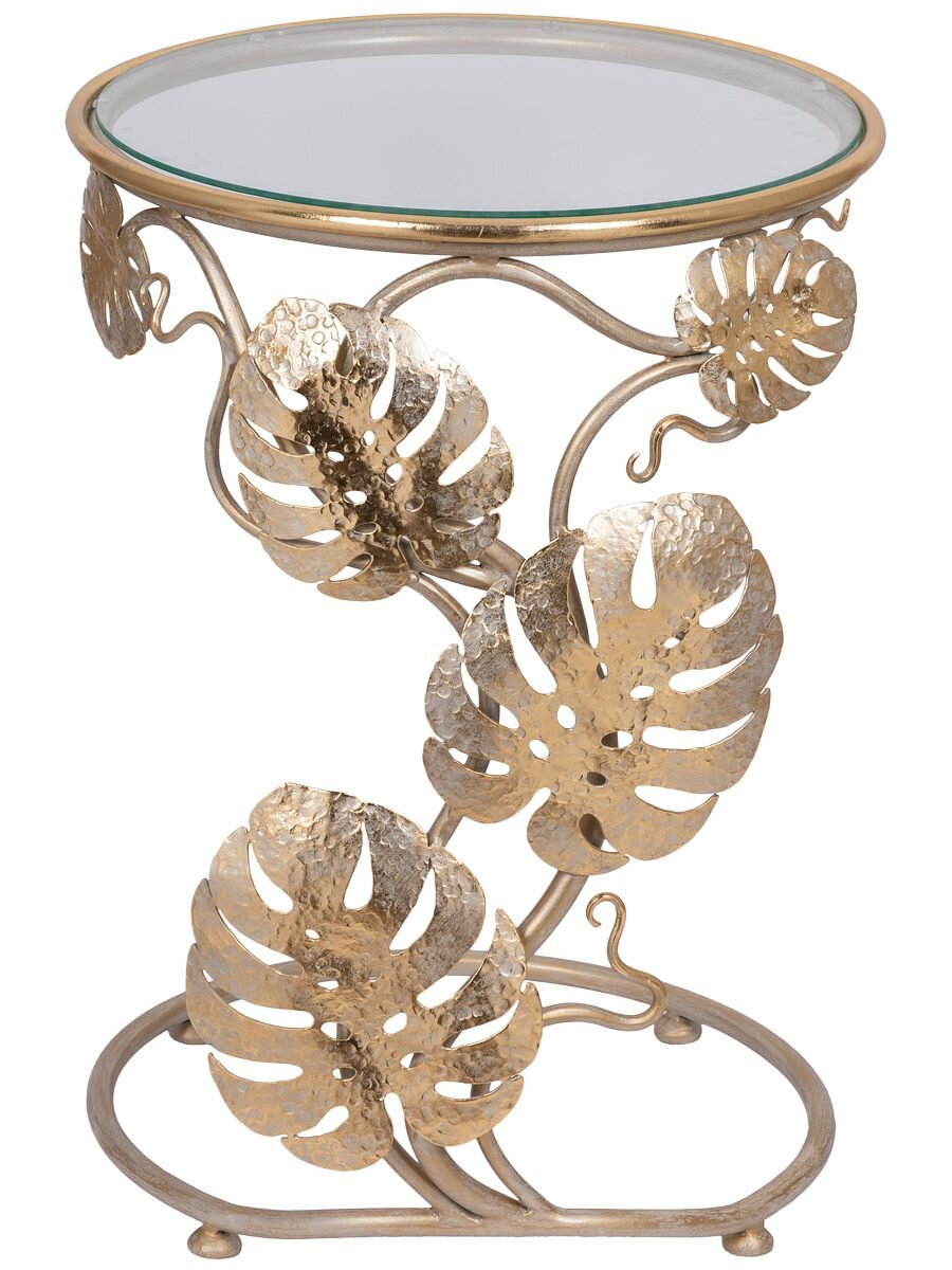 Купить Кофейный круглый столик Bogacho Monstera Deliciosa со стеклянной столешницей и фигурной металлической ножкой в виде листов монстеры