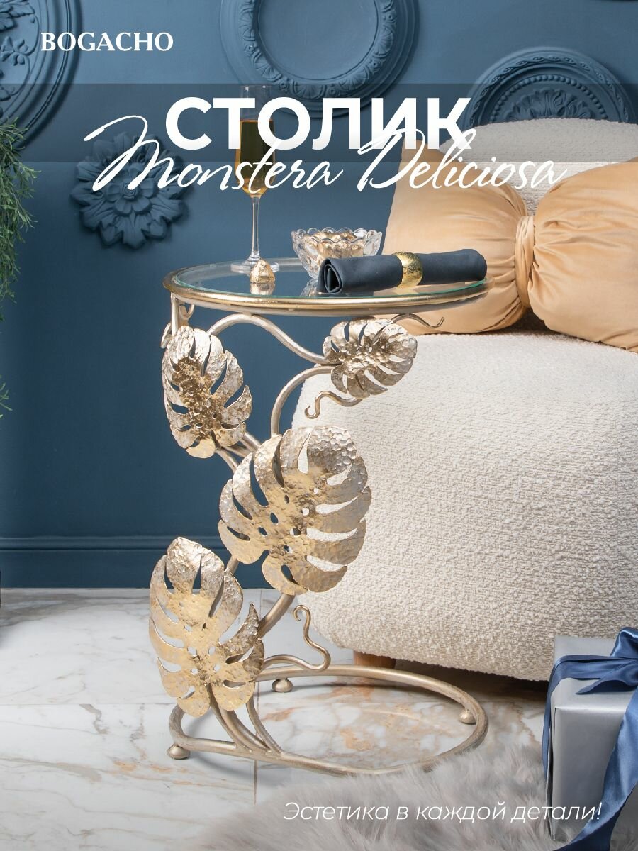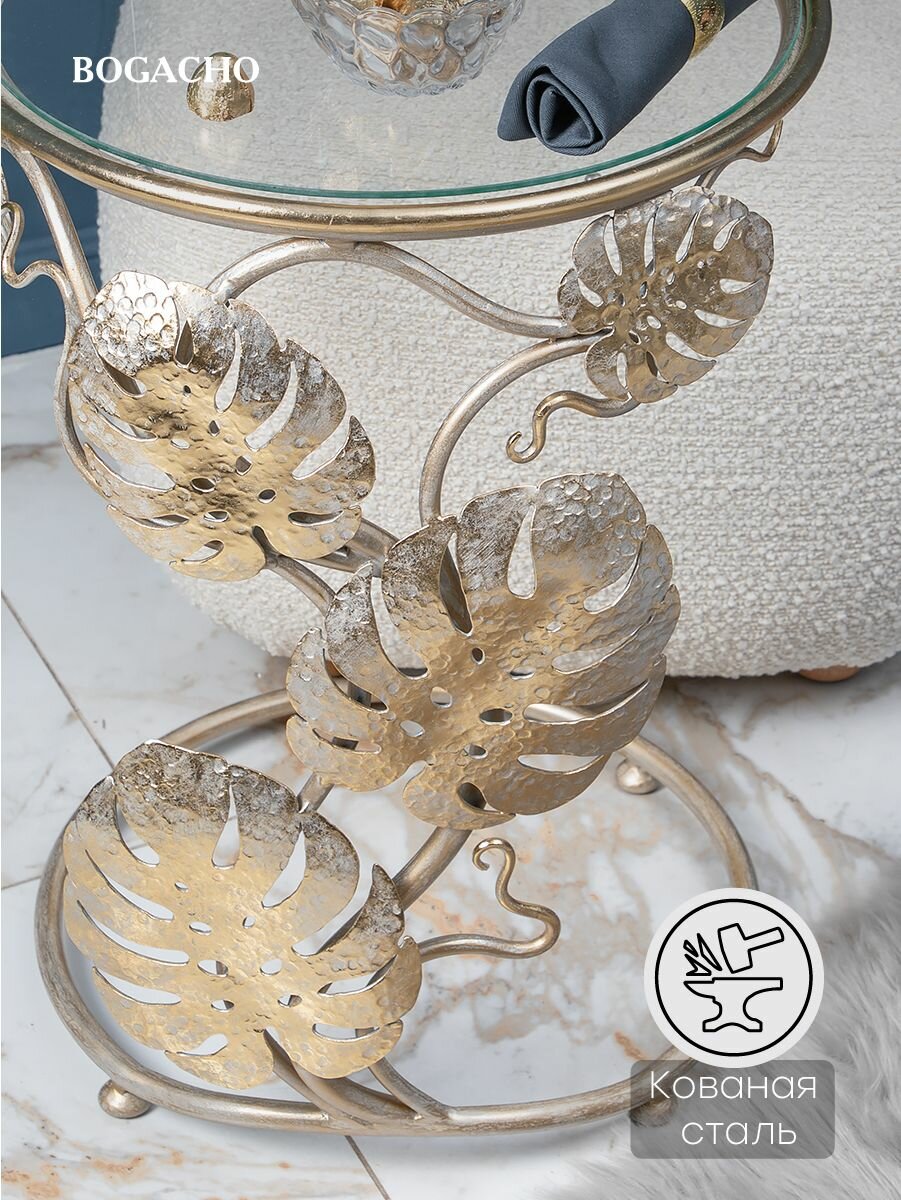 Кофейный круглый столик Bogacho Monstera Deliciosa со стеклянной столешницей и фигурной металлической ножкой в виде листов монстеры интересное: