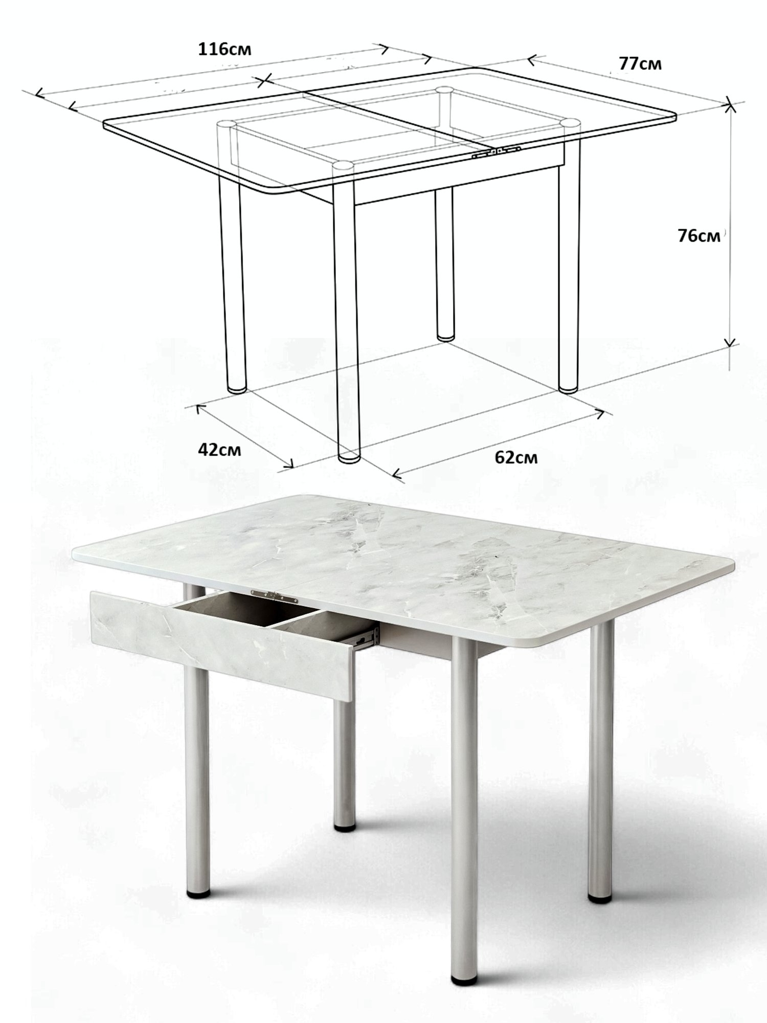 Сохранить77х58 (116) см Раскладной кухонный стол с ящиком, для кухни, столовой, дачи и дома, с металлическими ножками, Венис интересное: