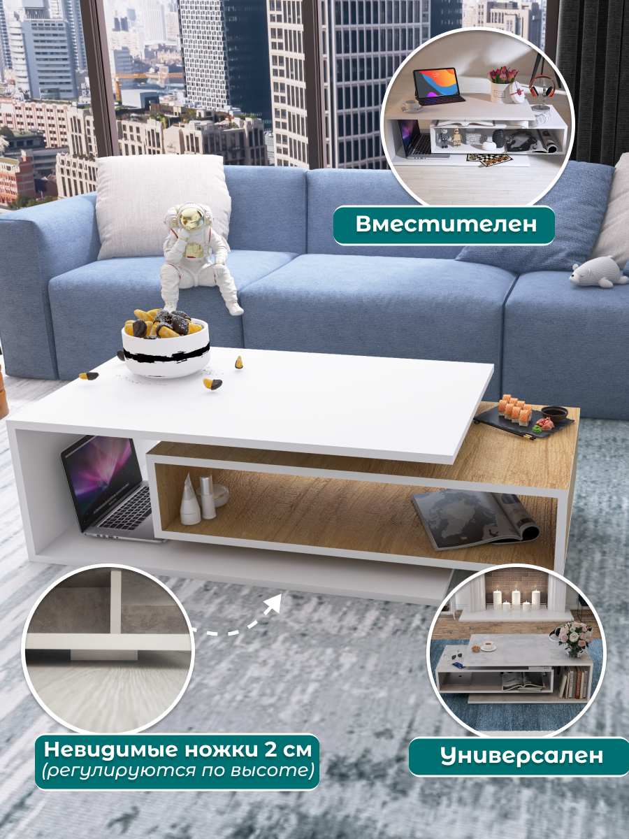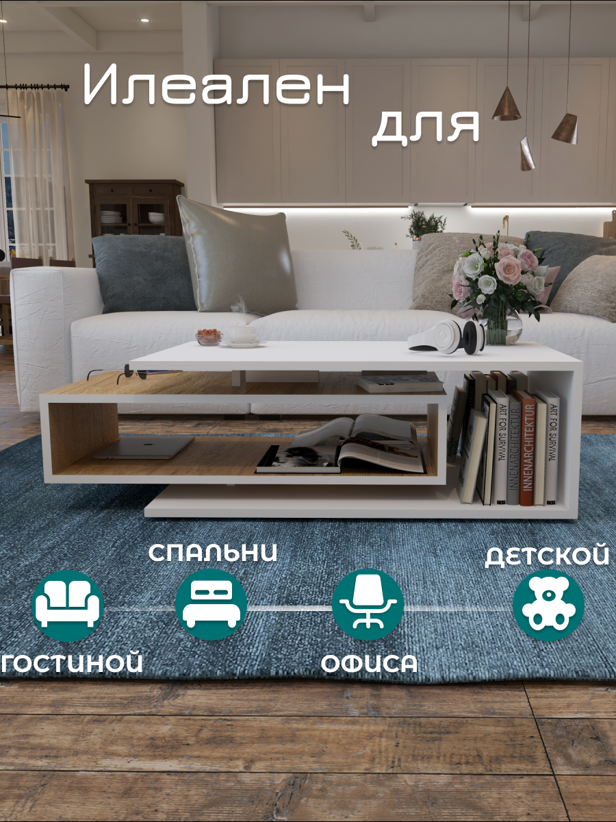 Журнальный стол Smart, белый/дуб, столик прикроватный, деревянный лофт, в спальню, в гостиную