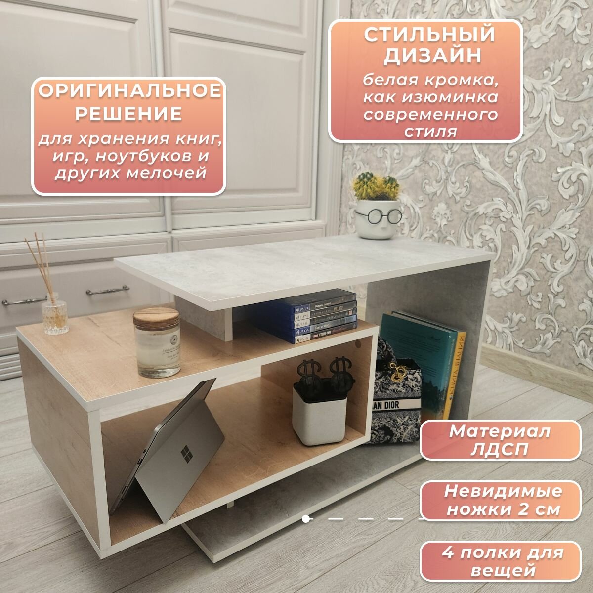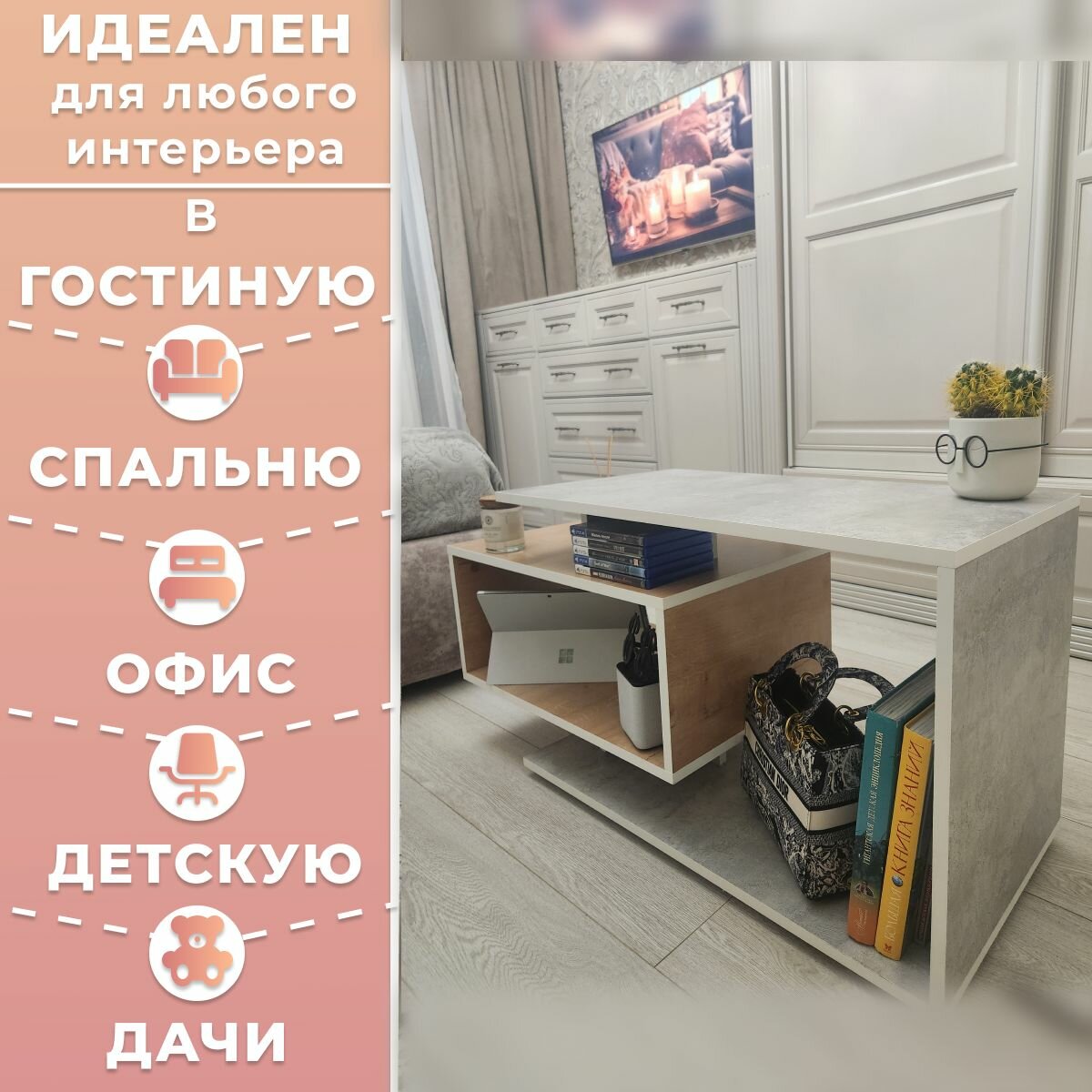 Журнальный стол Smart, бетон/белый, столик прикроватный, деревянный лофт, в спальню, в гостиную