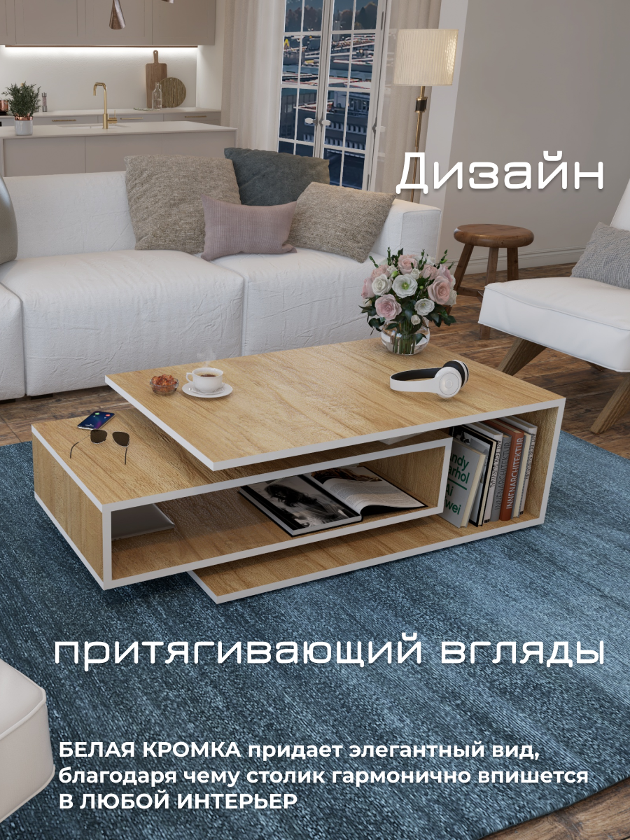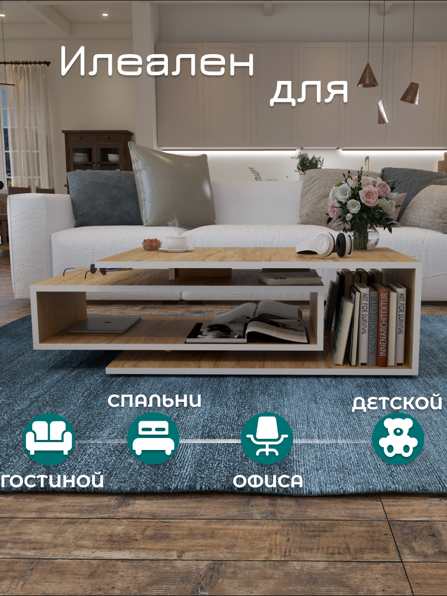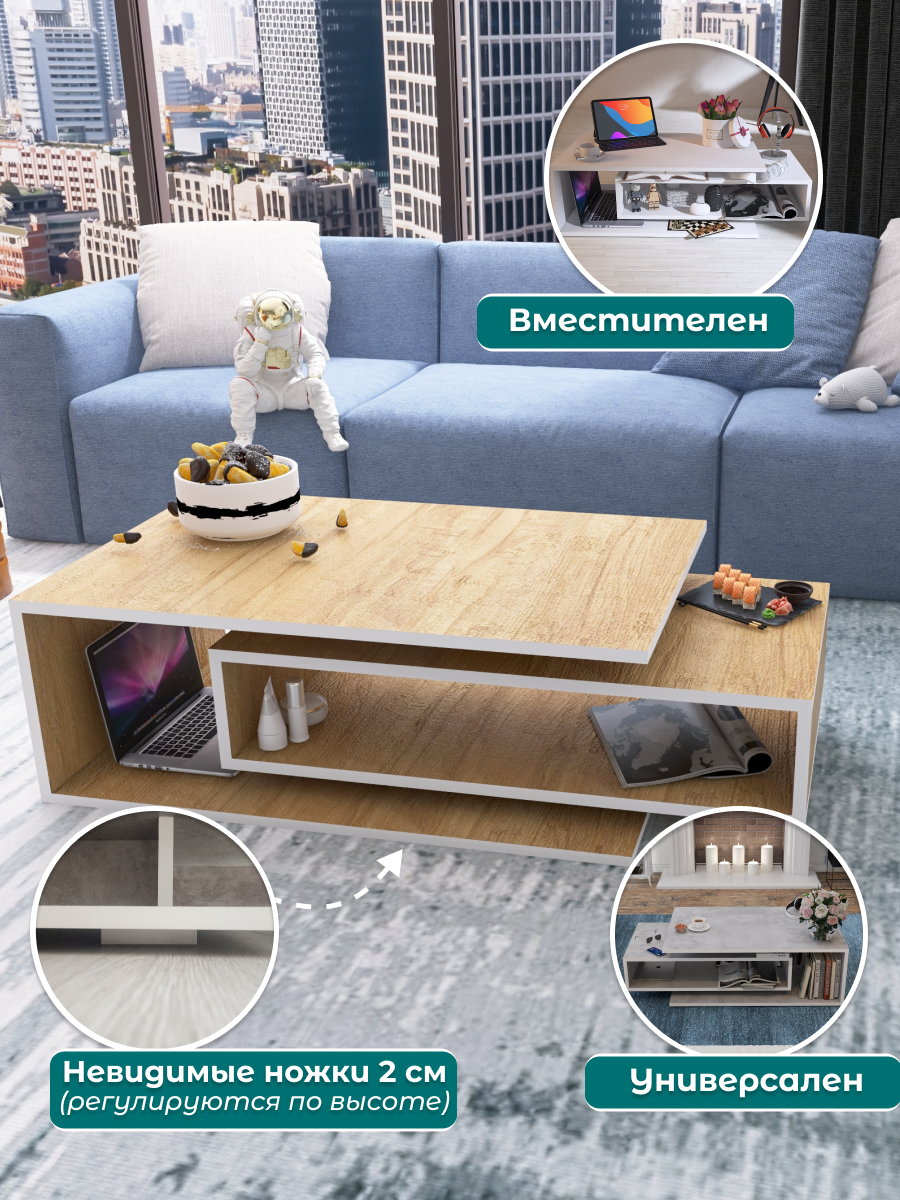 Журнальный стол Smart, белый/дуб, столик прикроватный, деревянный лофт, в спальню, в гостиную