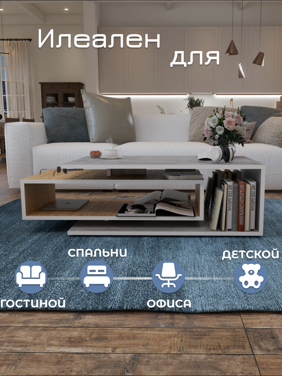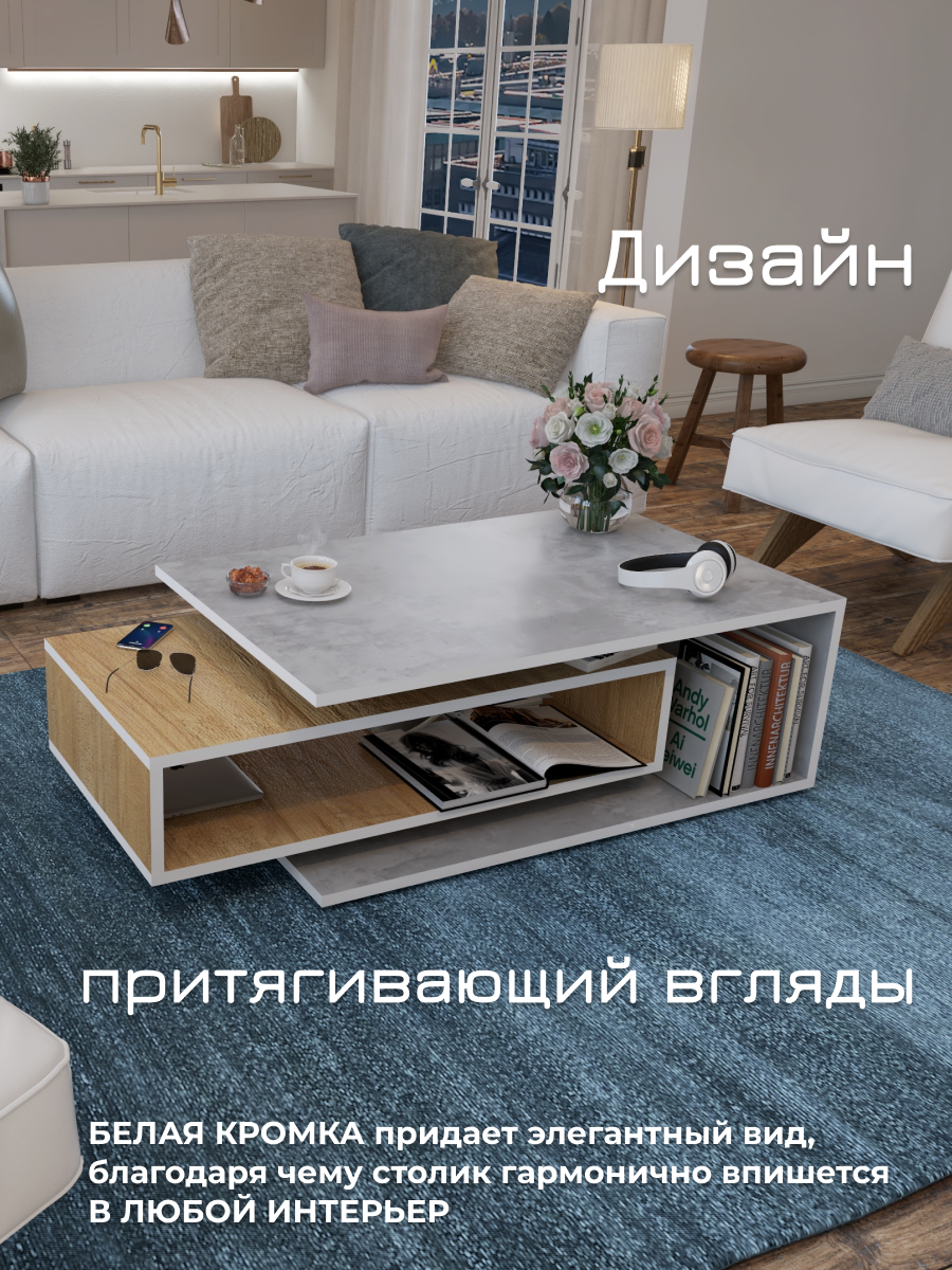 Журнальный стол Smart, бетон/белый, столик прикроватный, деревянный лофт, в спальню, в гостиную