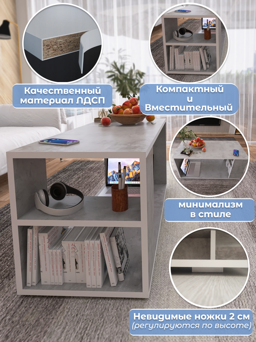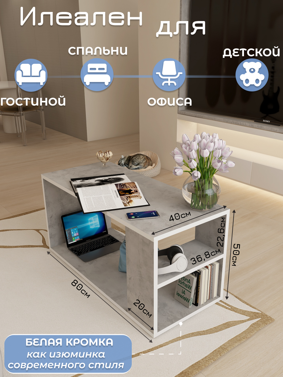 Журнальный стол Smart, бетон/белый, столик прикроватный, деревянный лофт, в спальню, в гостиную