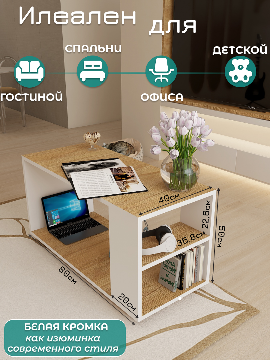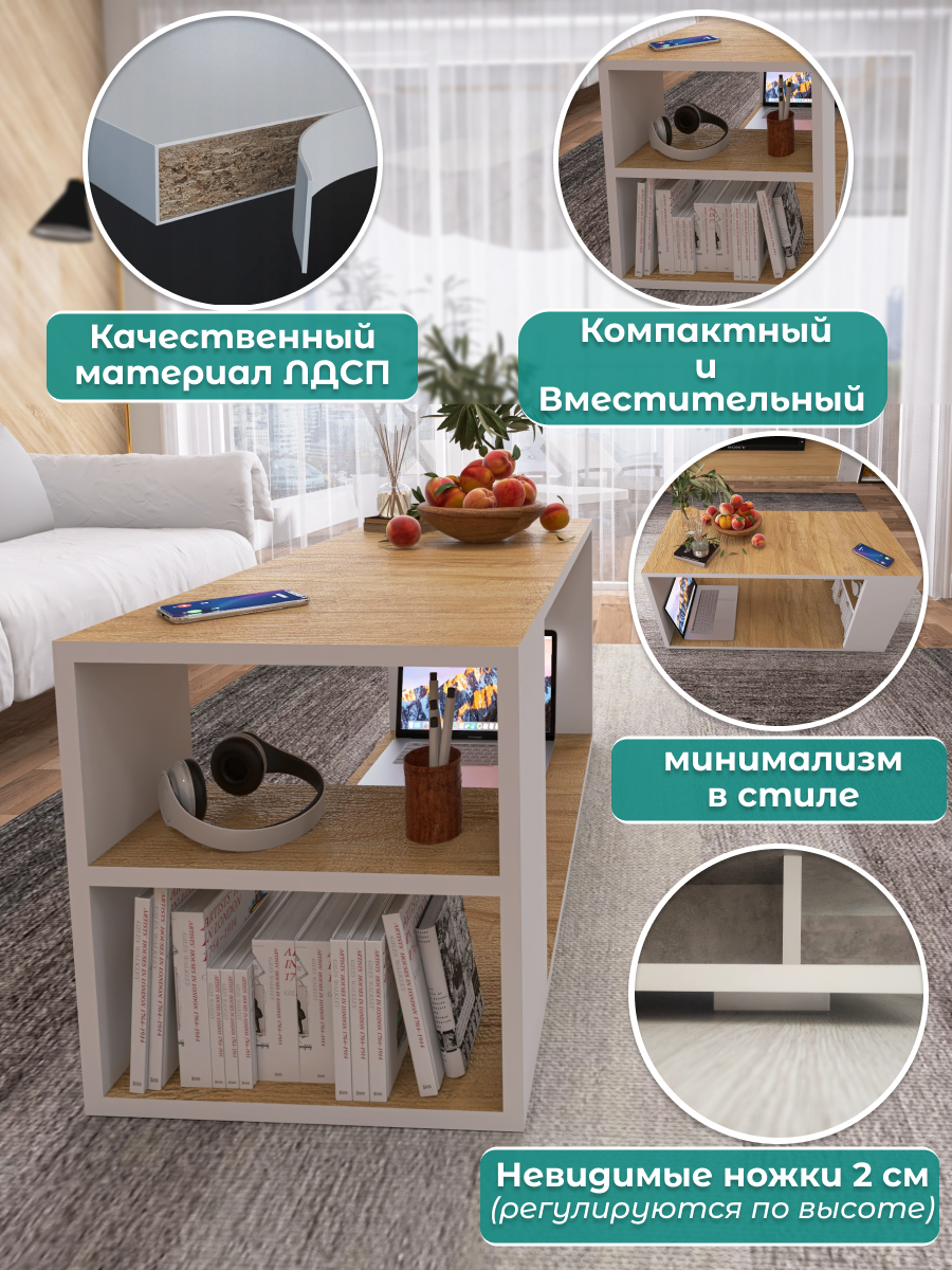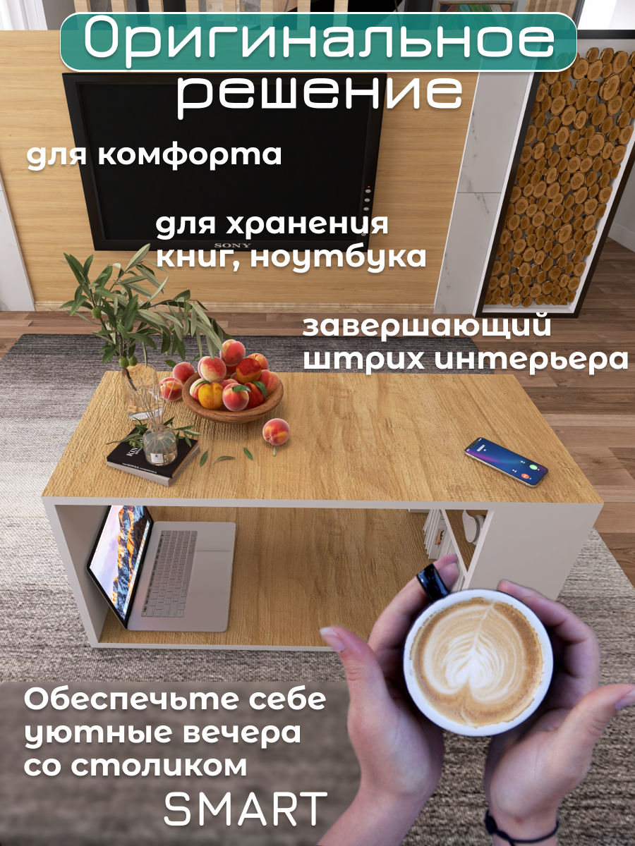 Журнальный стол Smart, белый/дуб, столик прикроватный, деревянный лофт, в спальню, в гостиную