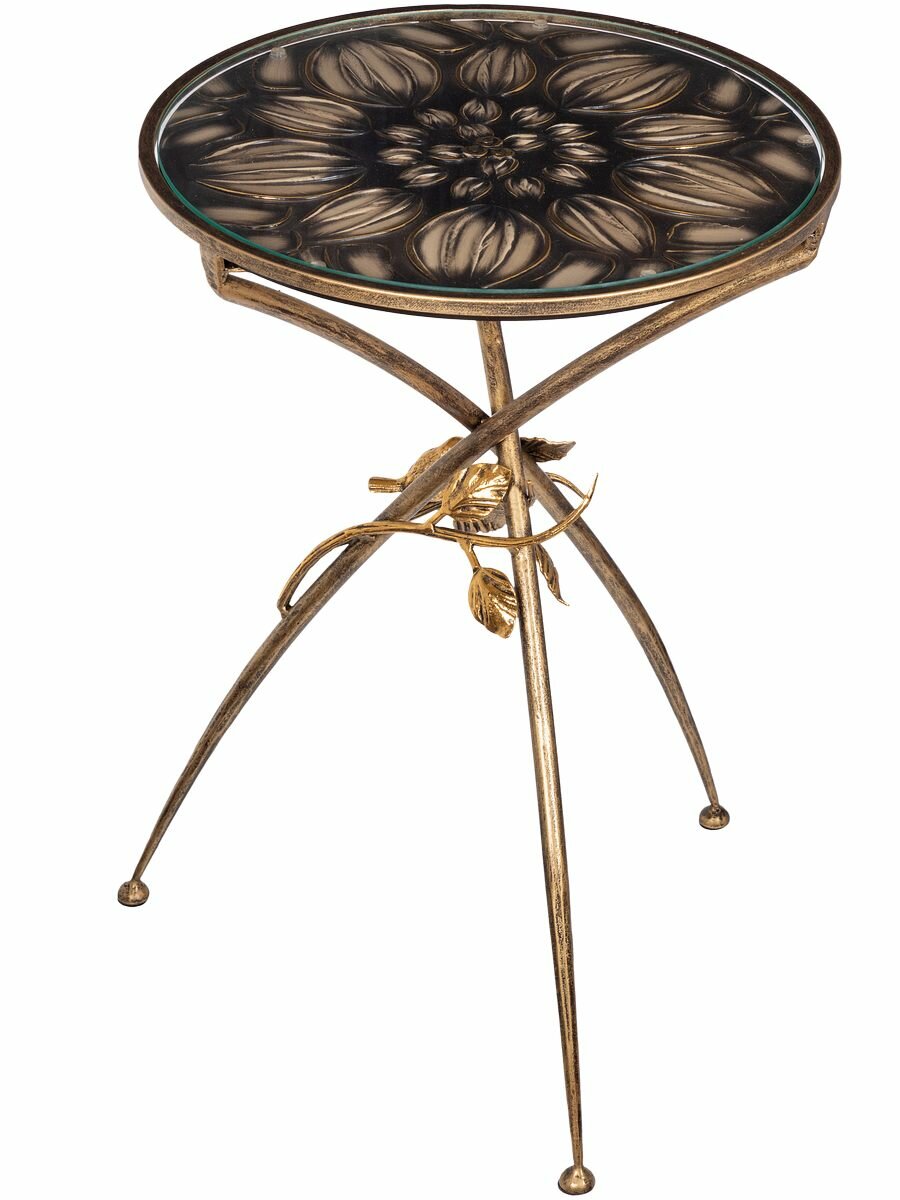 Кофейный круглый столик Bogacho Зарнички Санфлауэр со стеклянной столешницей и фигурными металлическими ножками с птичками интересное: