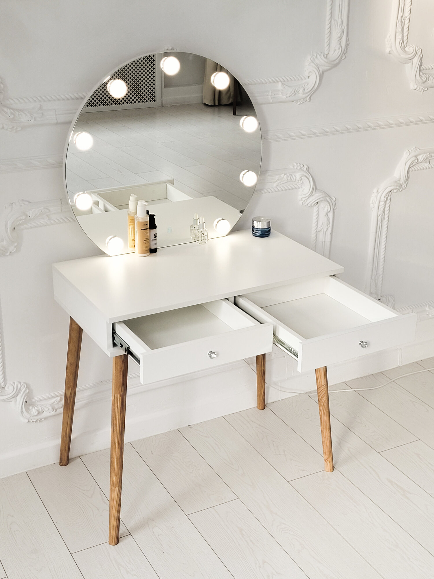 Туалетный гримерный столик с ящиком и круглым зеркалом с Led лампами (Wh+Vot65)