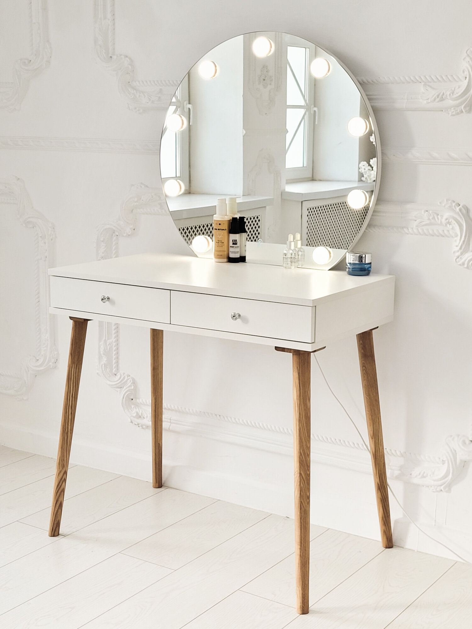 Туалетный гримерный столик с ящиком и круглым зеркалом с Led лампами (White+Vot(белый+дуб вотан)