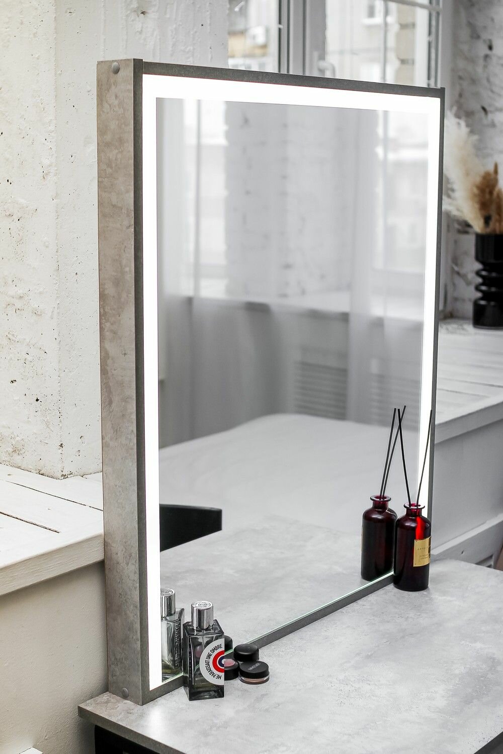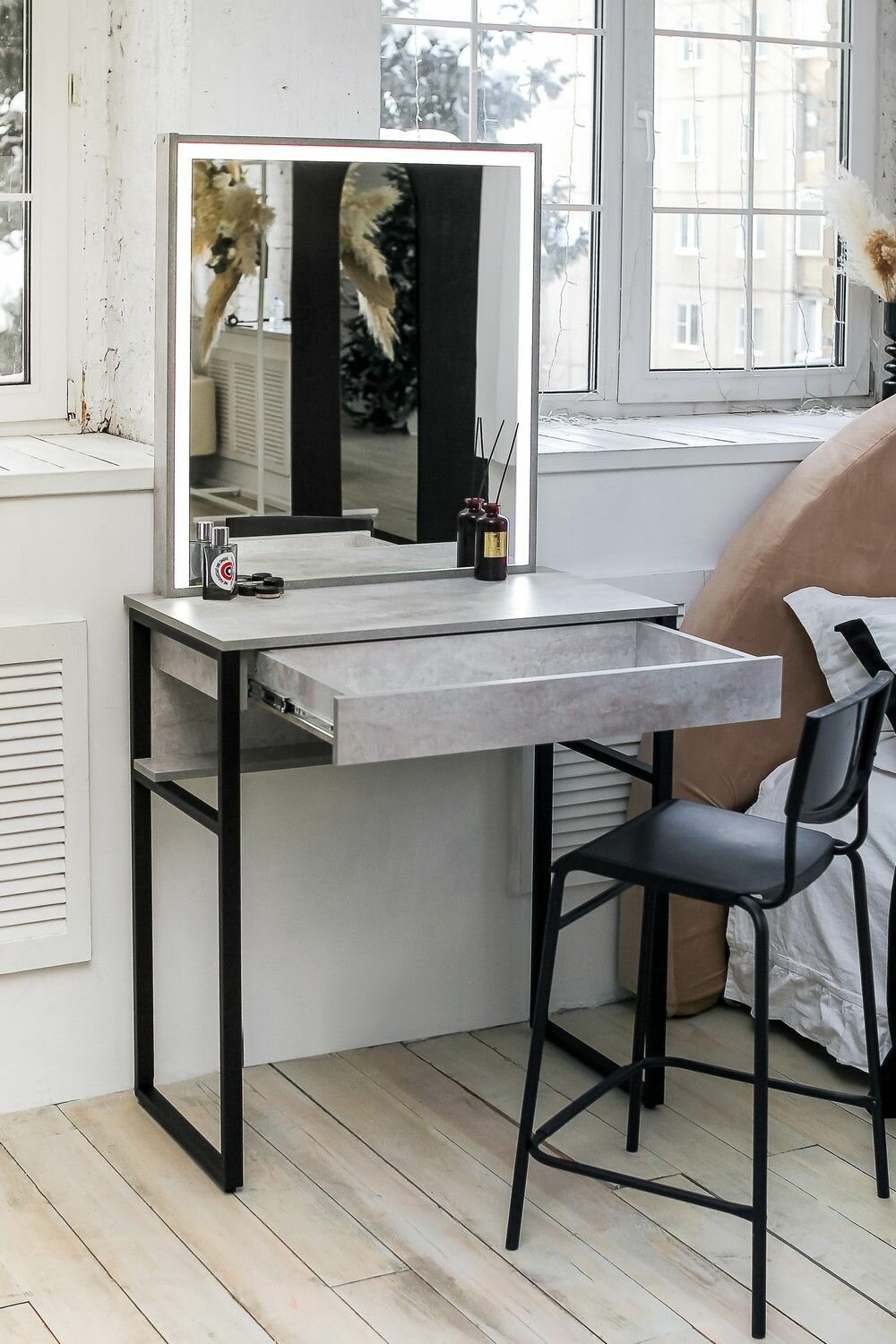 Высокий туалетный столик на металлических ножках LOFT, зеркало без рамы цемент