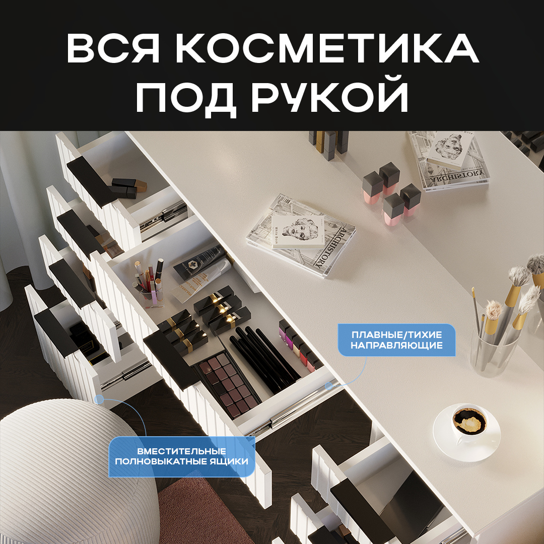 Туалетный столик GRIMSTOL 4Д120-ВТ, гримёрное зеркало, LED-подсветка для макияжа, для спальни, белый, Вельвет