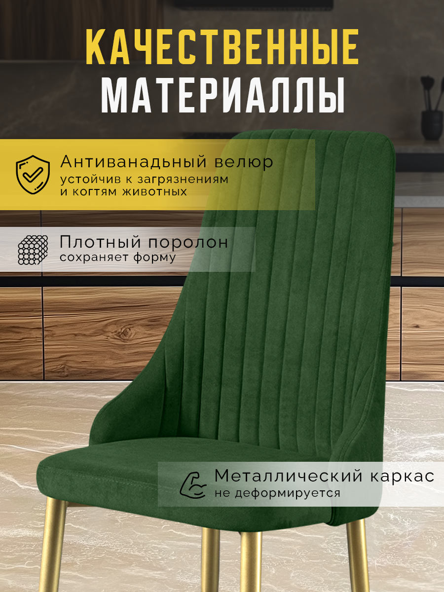 СохранитьСтулья для кухни Кора 2 шт мягкие, комплект, темно-зеленый с золотистыми ножками интересное: