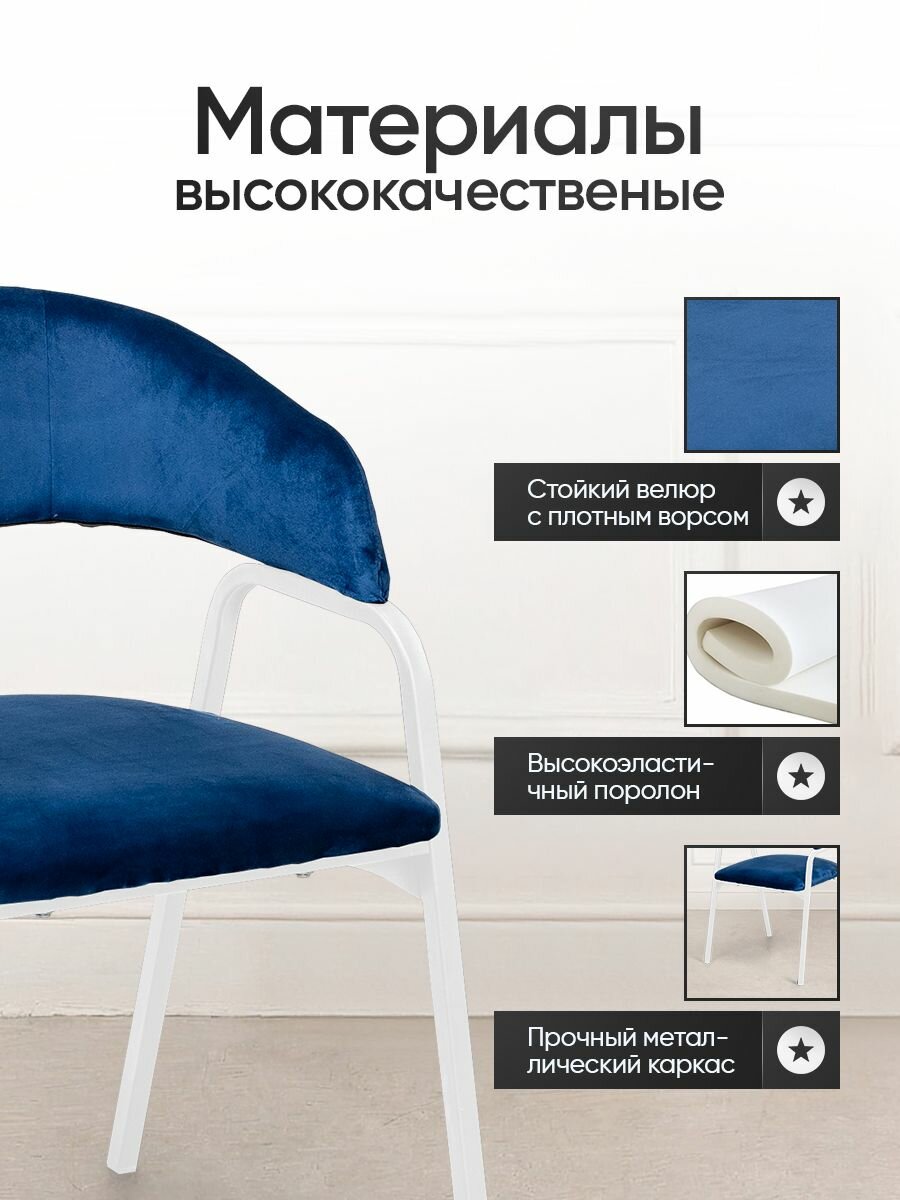 Купить Стулья для кухни комплект 4 шт, мягкий со спинкой и подлокотниками, кухонные обеденные для дома, велюровые Синие, белые ножки.