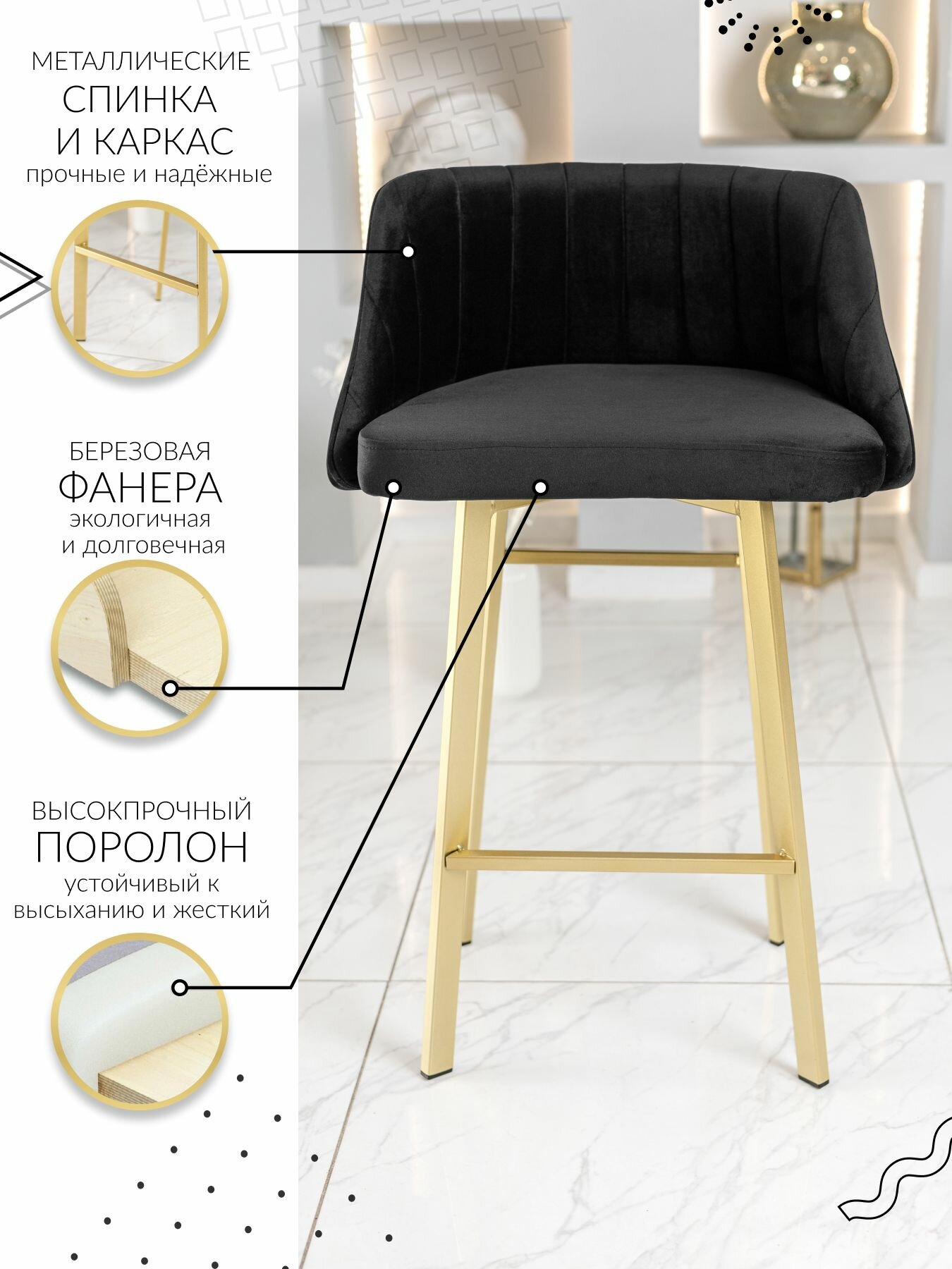 Барный стул со спинкой 1 шт. цвет черный, ножки золотые интересное: