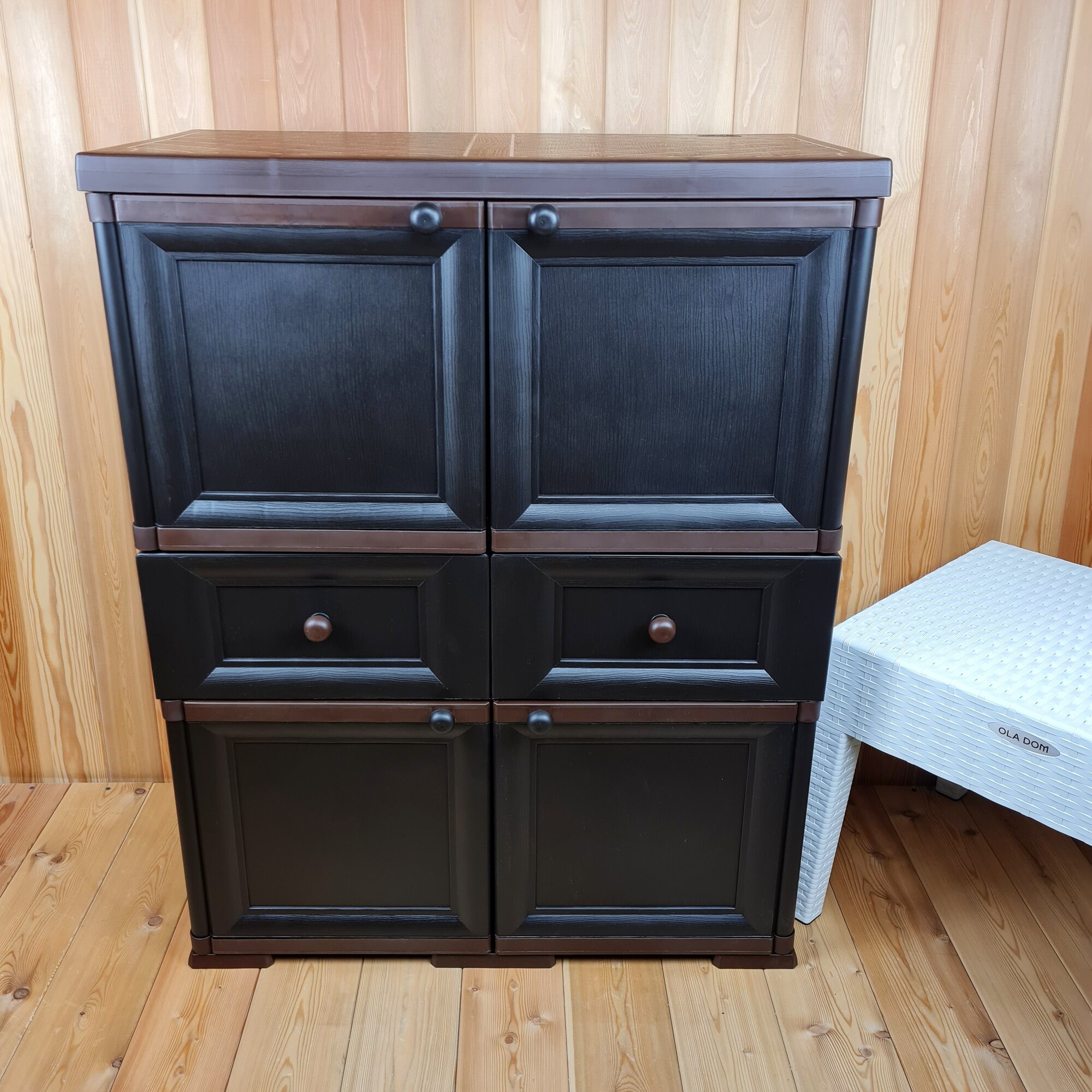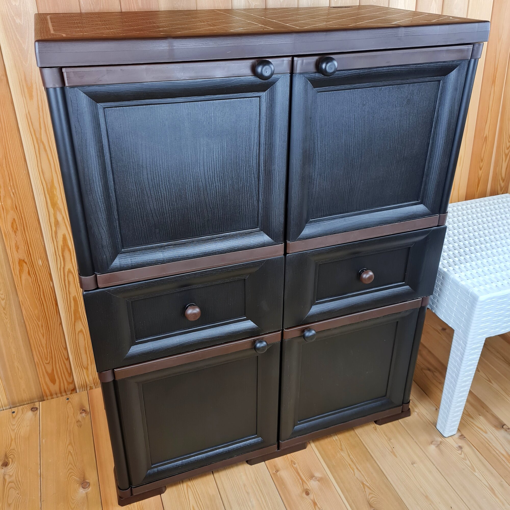 Тумба высокая "УЮТ" пластиковая, усиленная, 81х42х103 h, 2 ящика, 4 дверцы. Имитация фактуры дерева. Цвет: Коричневый с шоколадными дверцами. интересное: