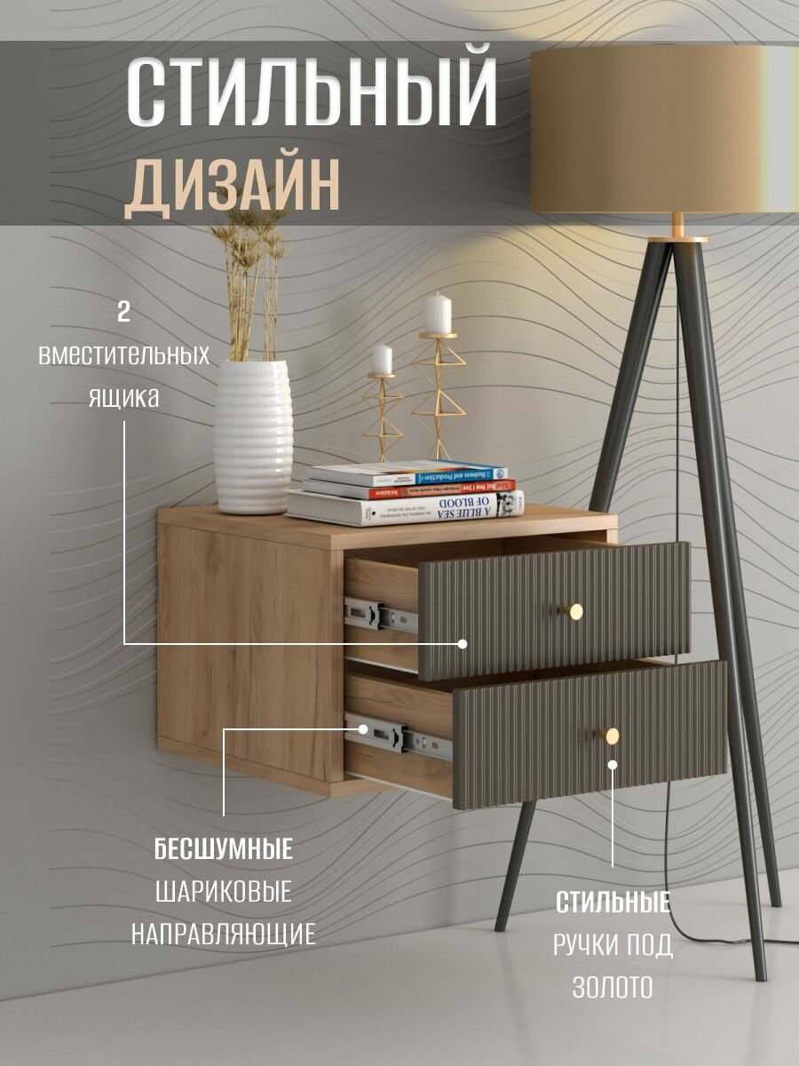 Тумба прикроватная подвесная Лайт, 2 ящика, 38х35х27 см , Дуб Крафт Золотой/Холст Вулкан интересное: