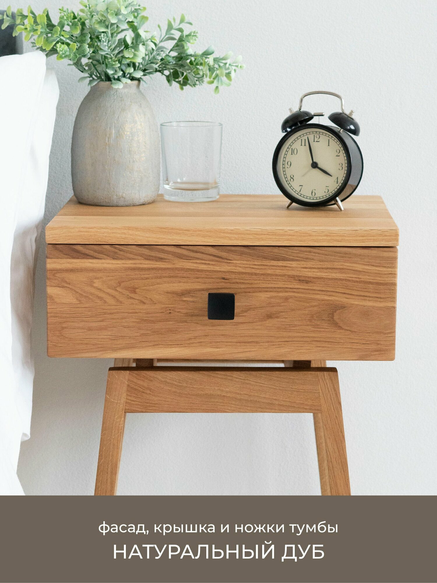 Тумба прикроватная Hugo из натурального дерева - массив сосны и березы, фасад и ножки дуб. Высота 45 см. Размер корпуса 30х39х15 см. Цвет: черный, орех. Ручка: квадратная