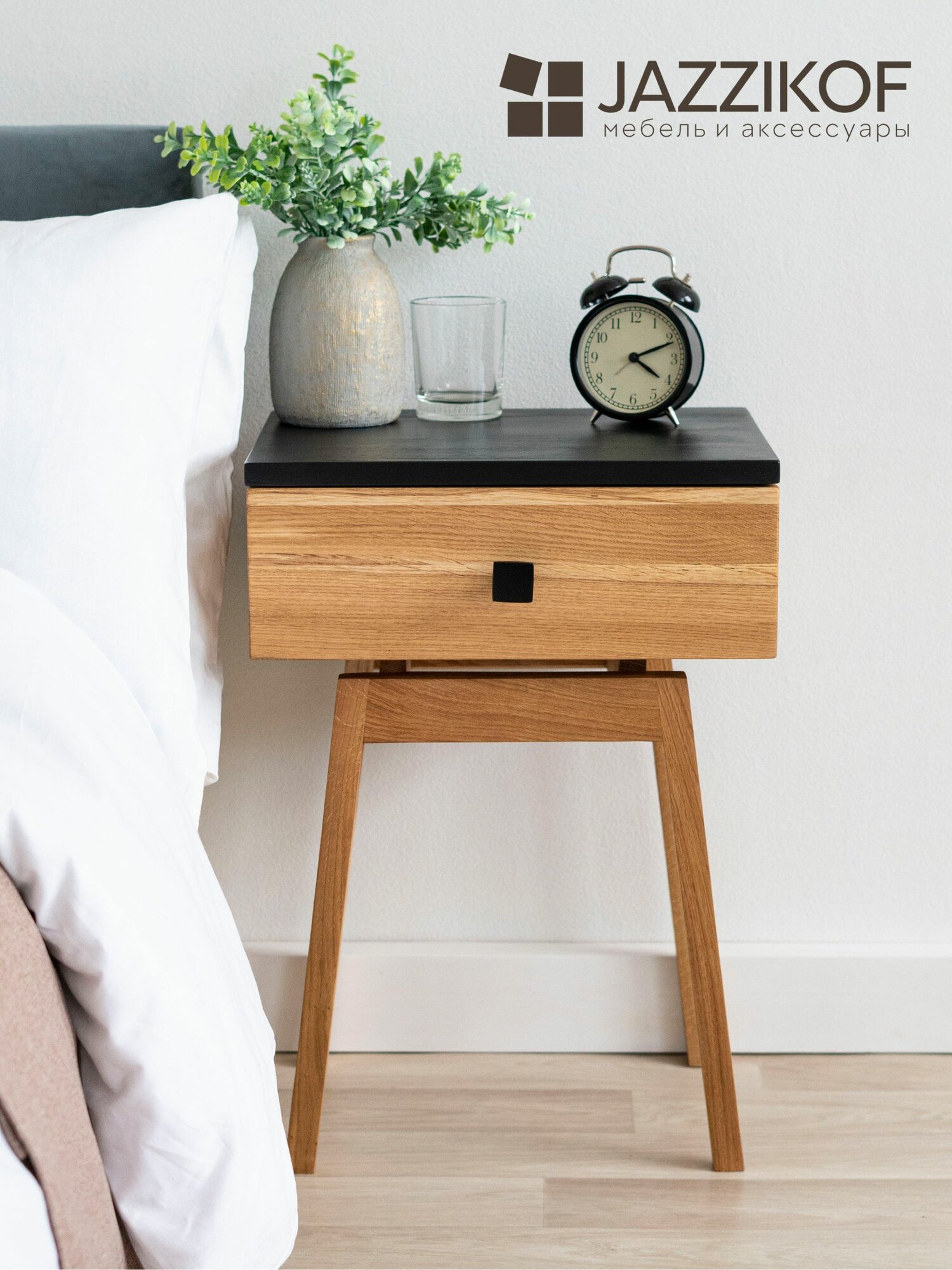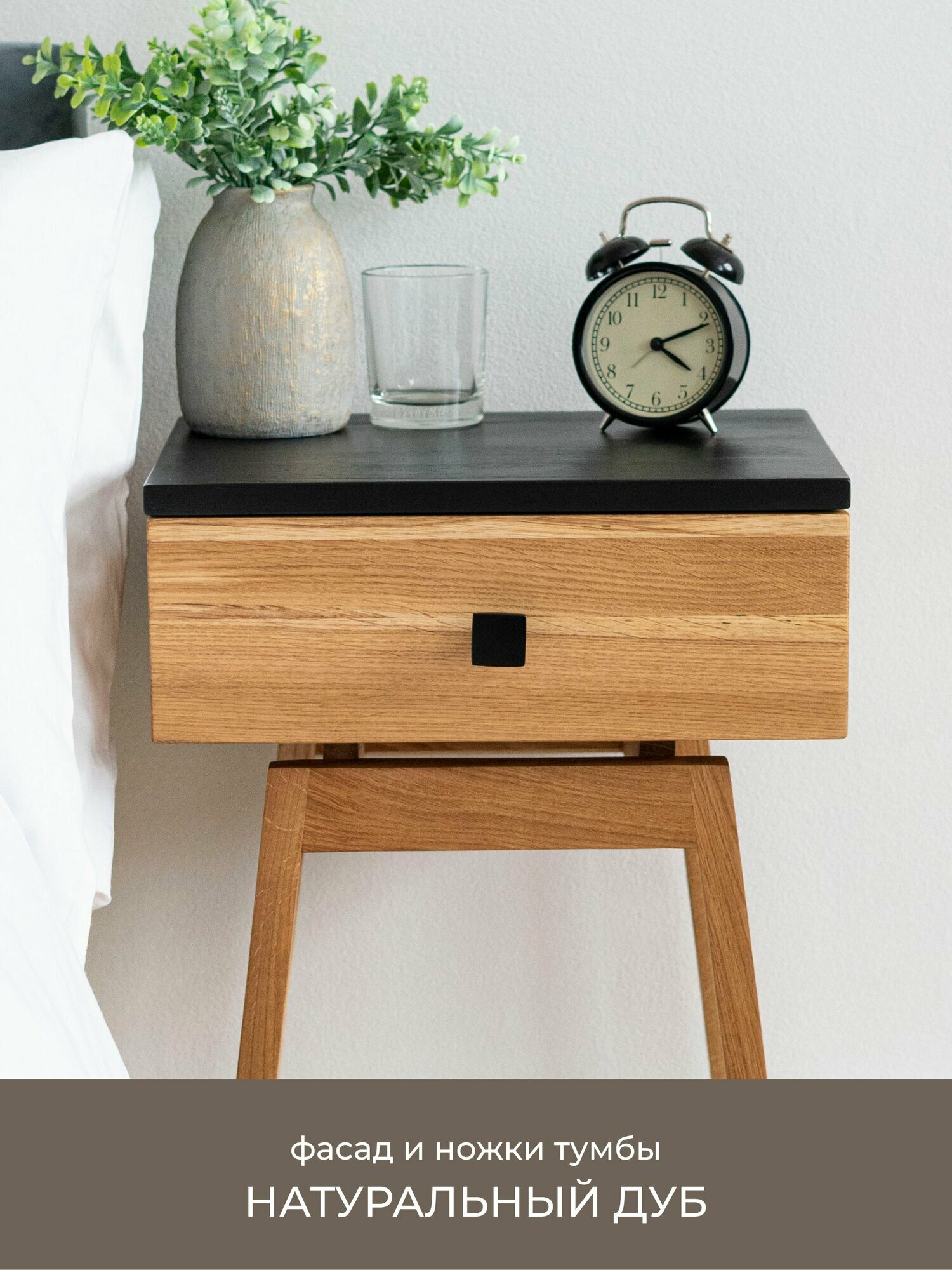 Тумба прикроватная Hugo из натурального дерева - массив сосны и березы, фасад и ножки дуб. Высота 45 см. Размер корпуса 30х39х15 см. Цвет: черный, орех. Ручка: квадратная