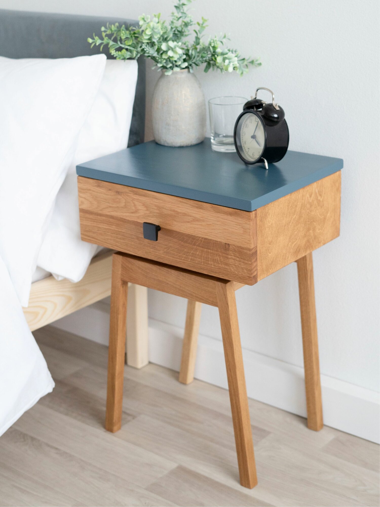 Тумба прикроватная Hugo из натурального дерева. Высота 50 см. Парящий корпус 30х39х15 см. Цвет: натуральный, синий.