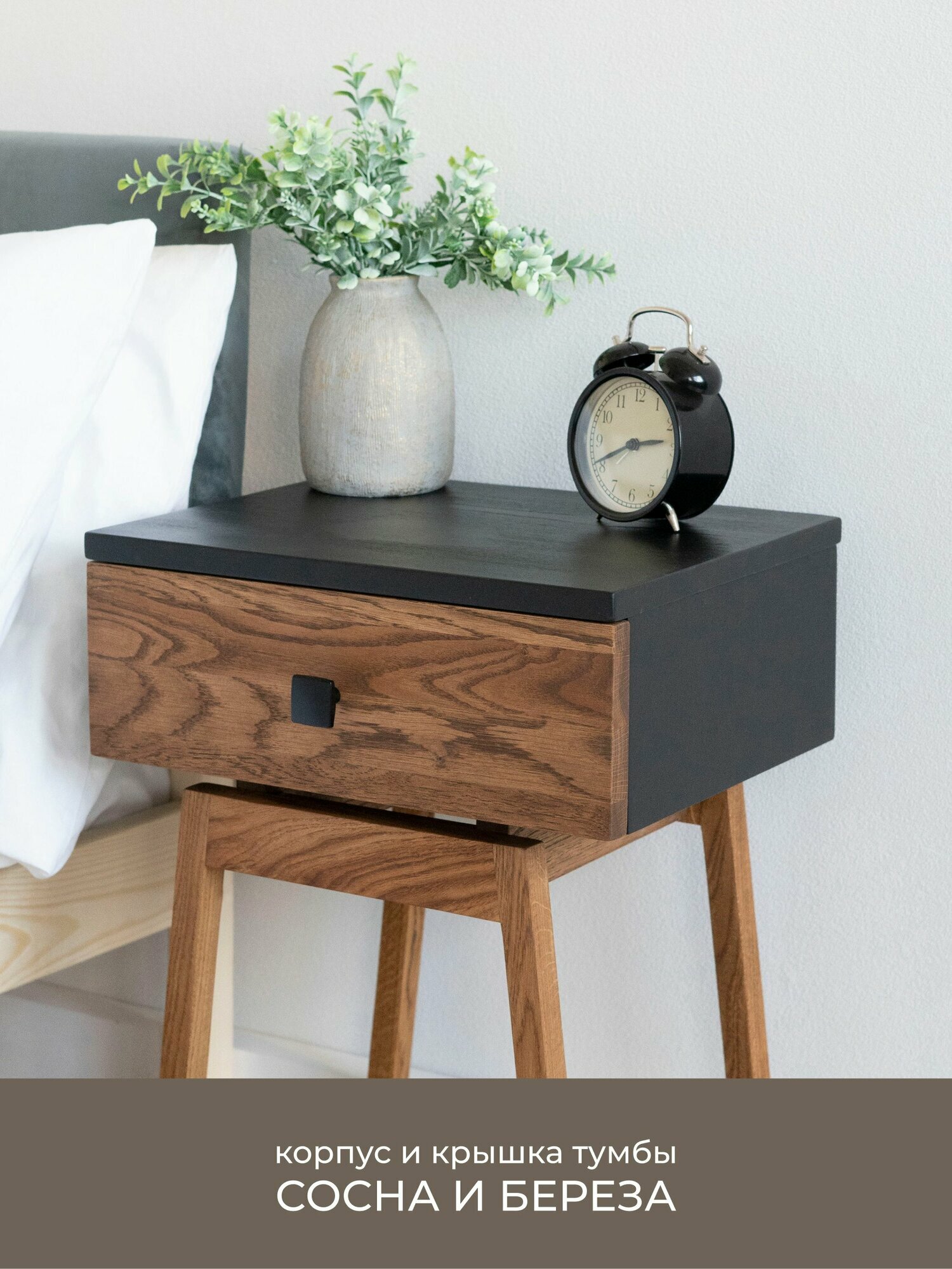 Тумба прикроватная Hugo из натурального дерева - массив сосны и березы, фасад и ножки дуб. Высота 45 см. Размер корпуса 30х39х15 см. Цвет: черный, орех. Ручка: квадратная