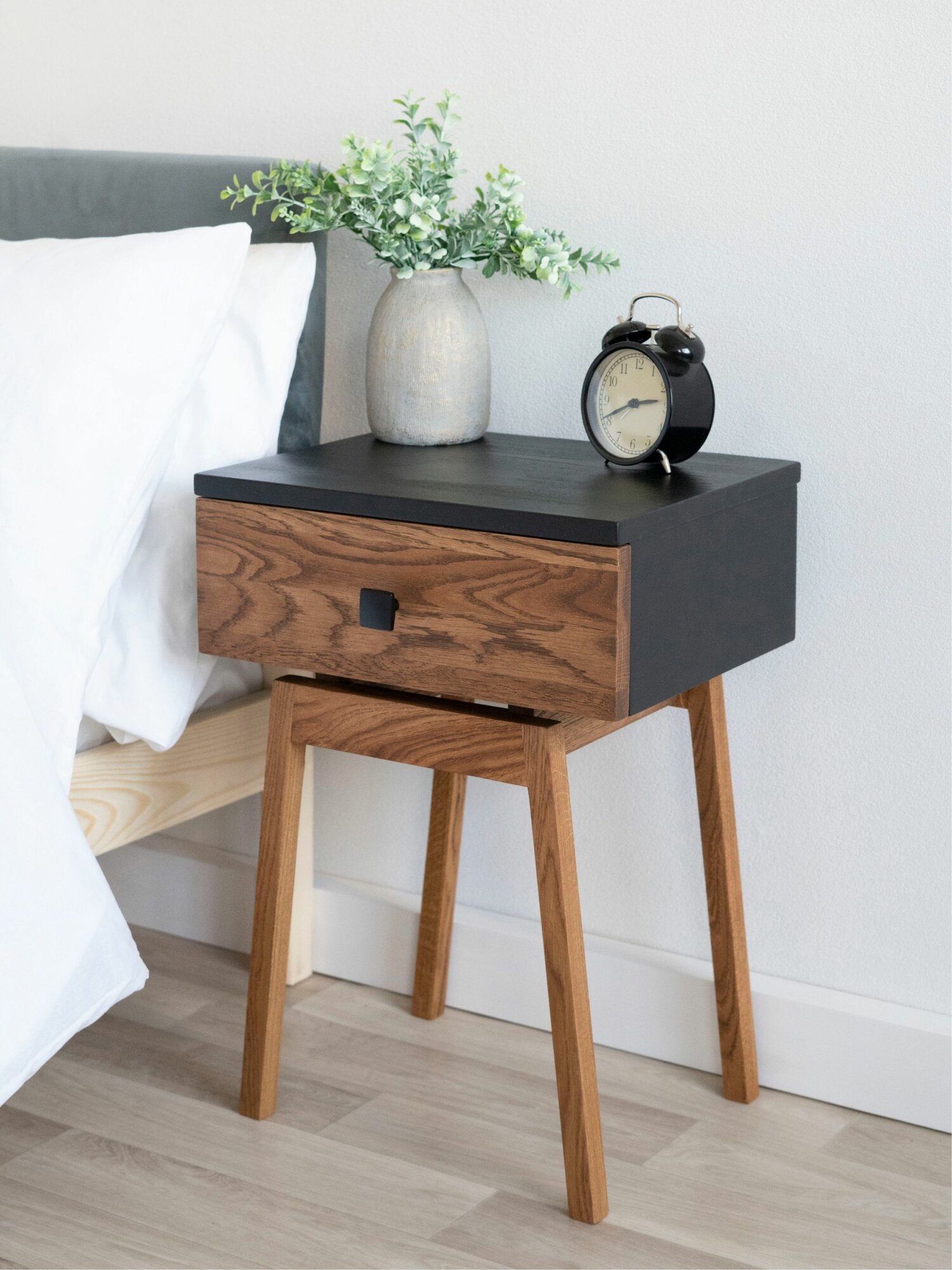 Купить Тумба прикроватная Hugo из натурального дерева - массив сосны и березы, фасад и ножки дуб. Высота 45 см. Размер корпуса 30х39х15 см. Цвет: черный, орех. Ручка: квадратная