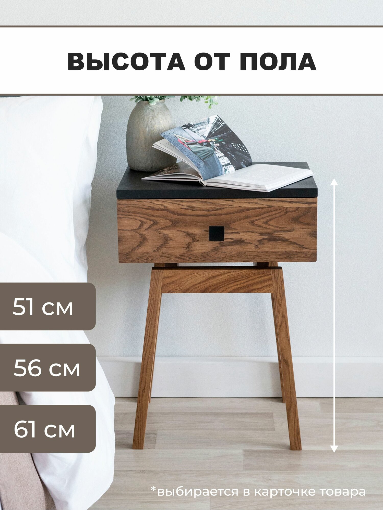 Тумба прикроватная Hugo из натурального дерева. Высота 50 см. Парящий корпус 30х39х15 см. Цвет: можжевельник, черный.