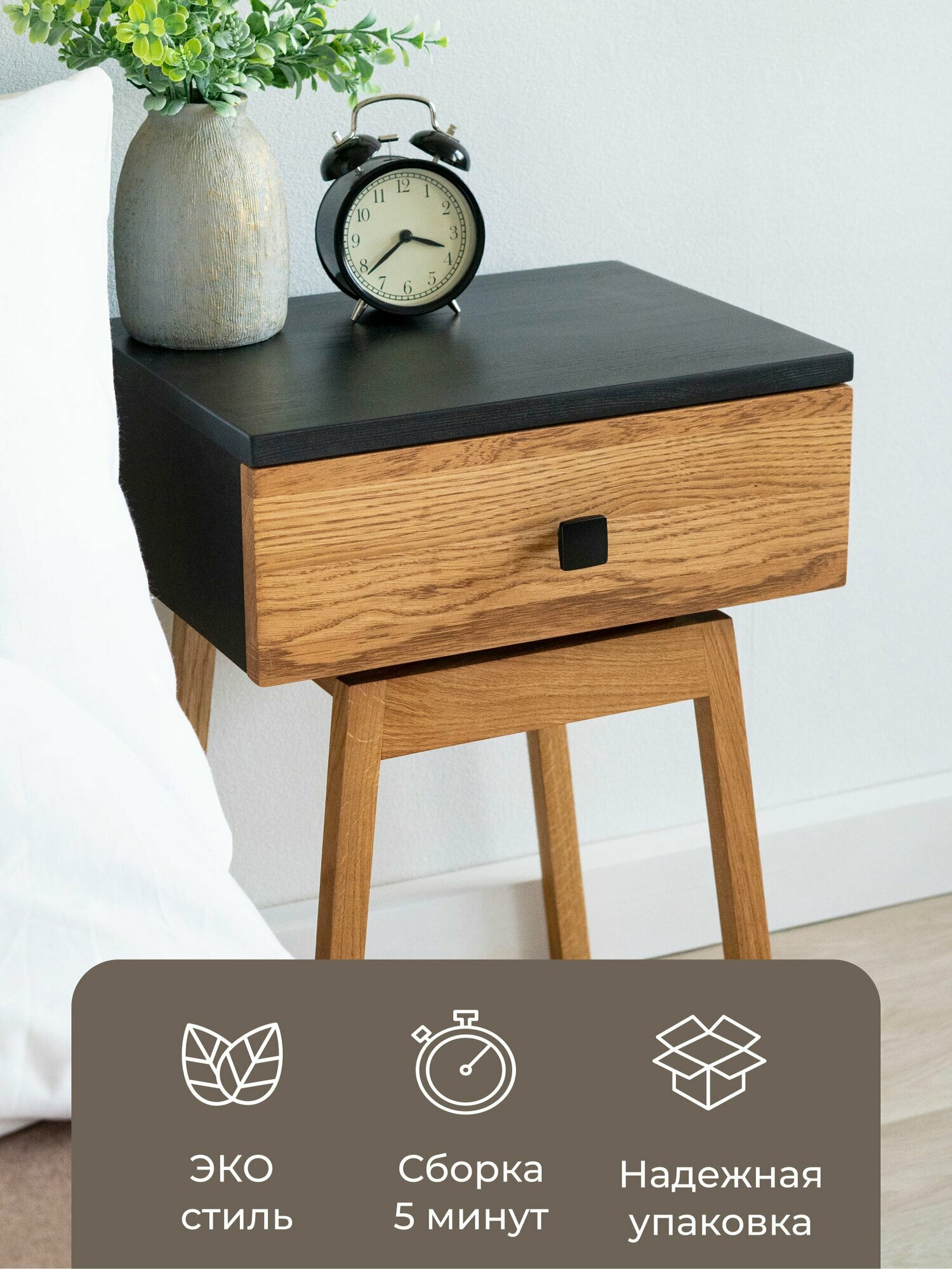 Тумба прикроватная Hugo из натурального дерева - массив сосны и березы, фасад и ножки дуб. Высота 45 см. Размер корпуса 30х39х15 см. Цвет: черный, орех. Ручка: квадратная