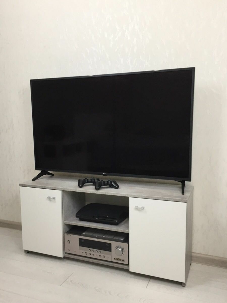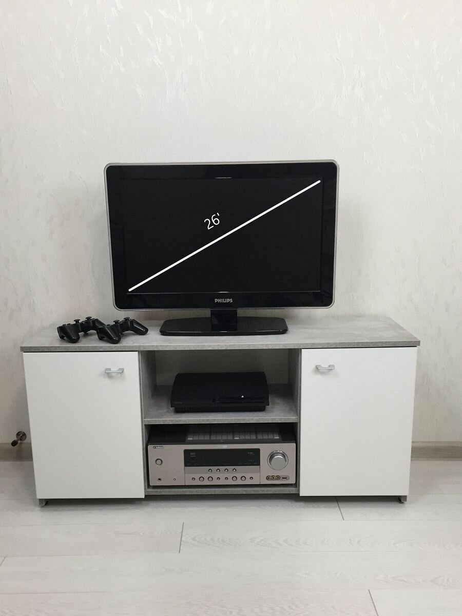 СохранитьТумба под телевизор напольная Смайл ТВ с доводчиками, с полками, с дверцами, закрытая, 111х34х51см, Белый Шагрень/Бетон интересное:
