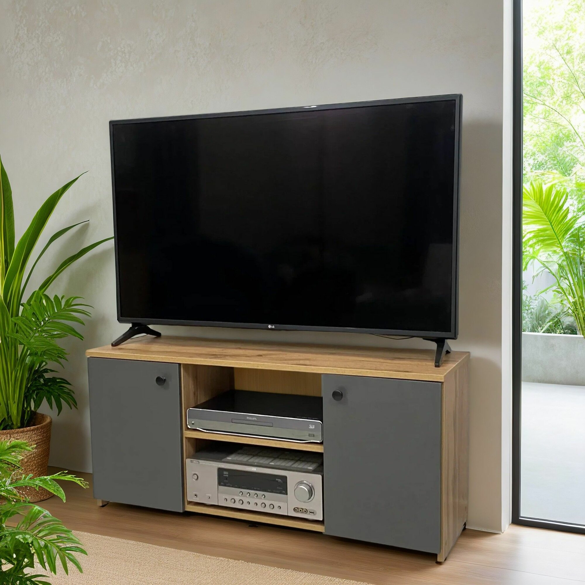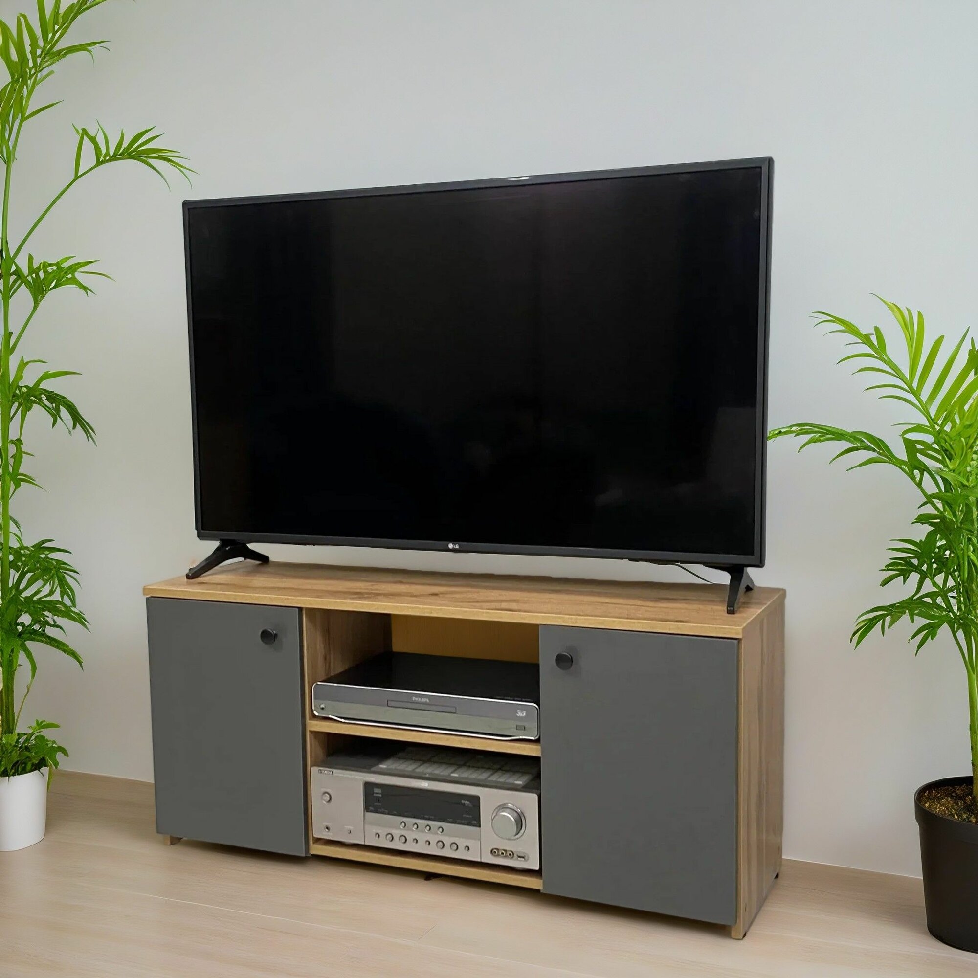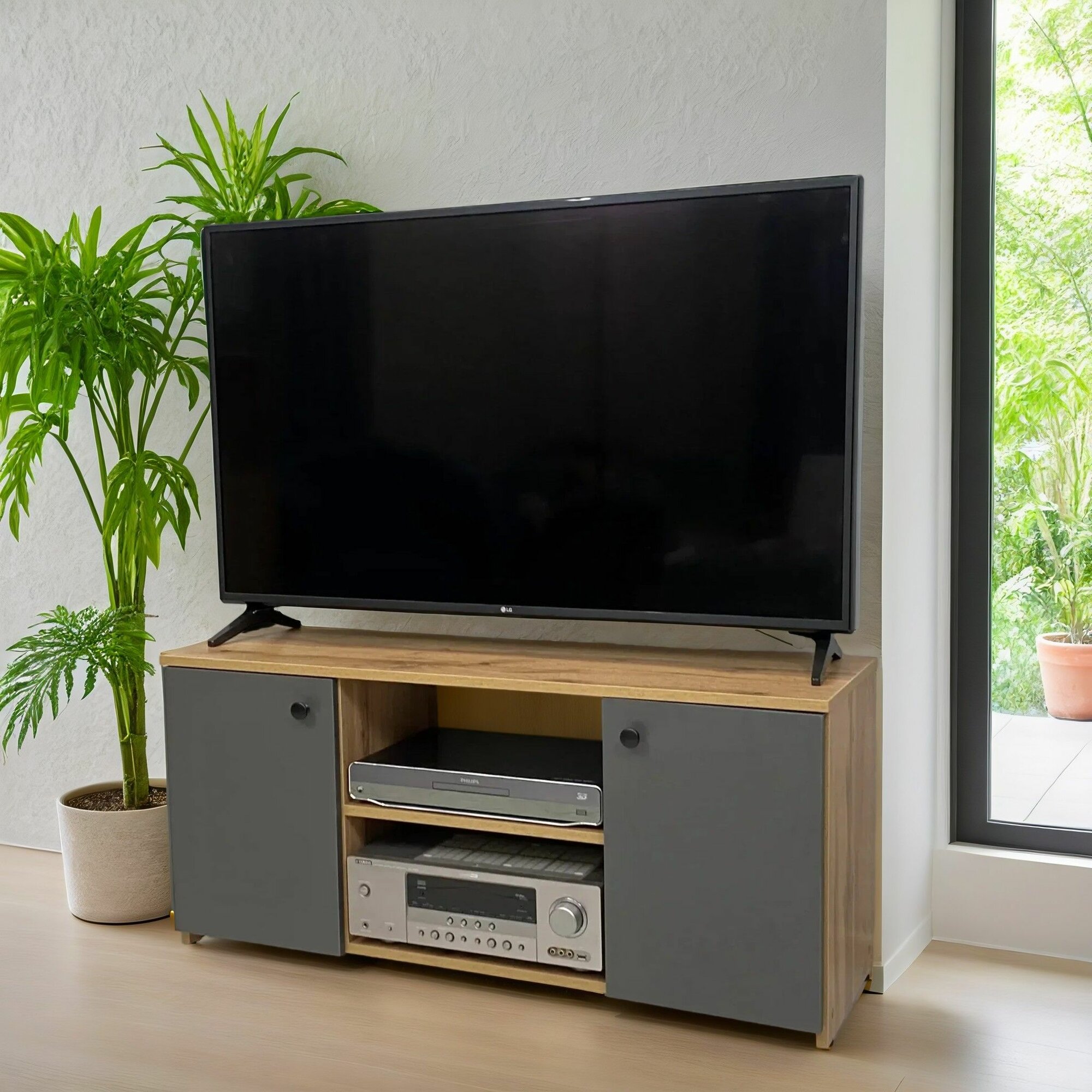 Купить Тумба под телевизор напольная Смайл ТВ с доводчиками, с полками, с дверцами, закрытая, 111х34х51см, Дуб Вотан/Антрацит